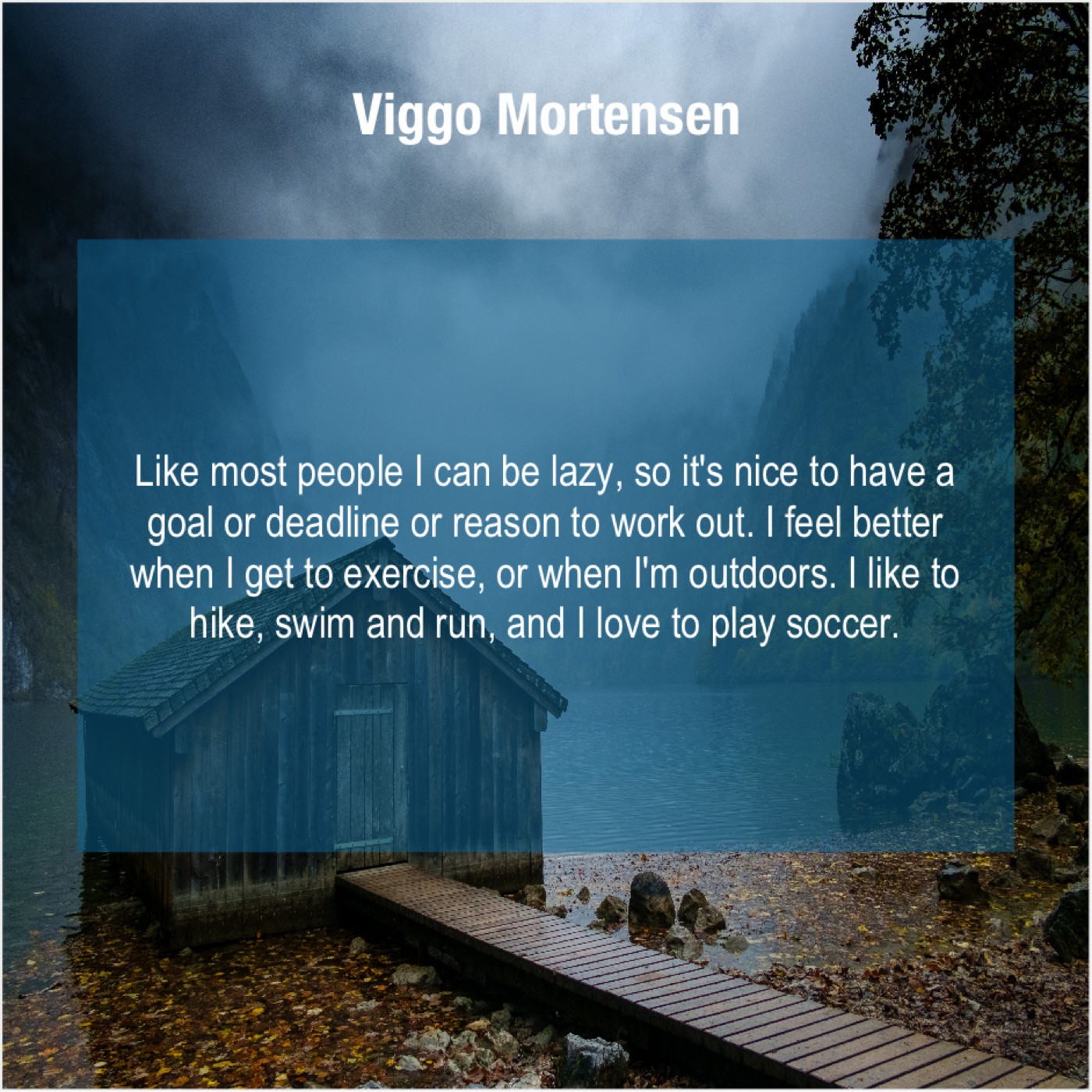 Viggo Mortensen Viggo Mortensen – Like most people I can… June 23, 2019 admin “Like most people I can be lazy, so it’s nice to have a goal or deadline or reason to work out. I feel better when I get to exercise, or when I’m outdoors. I like to hike, swim and run, and I love to play soccer.”-Viggo Mortensen