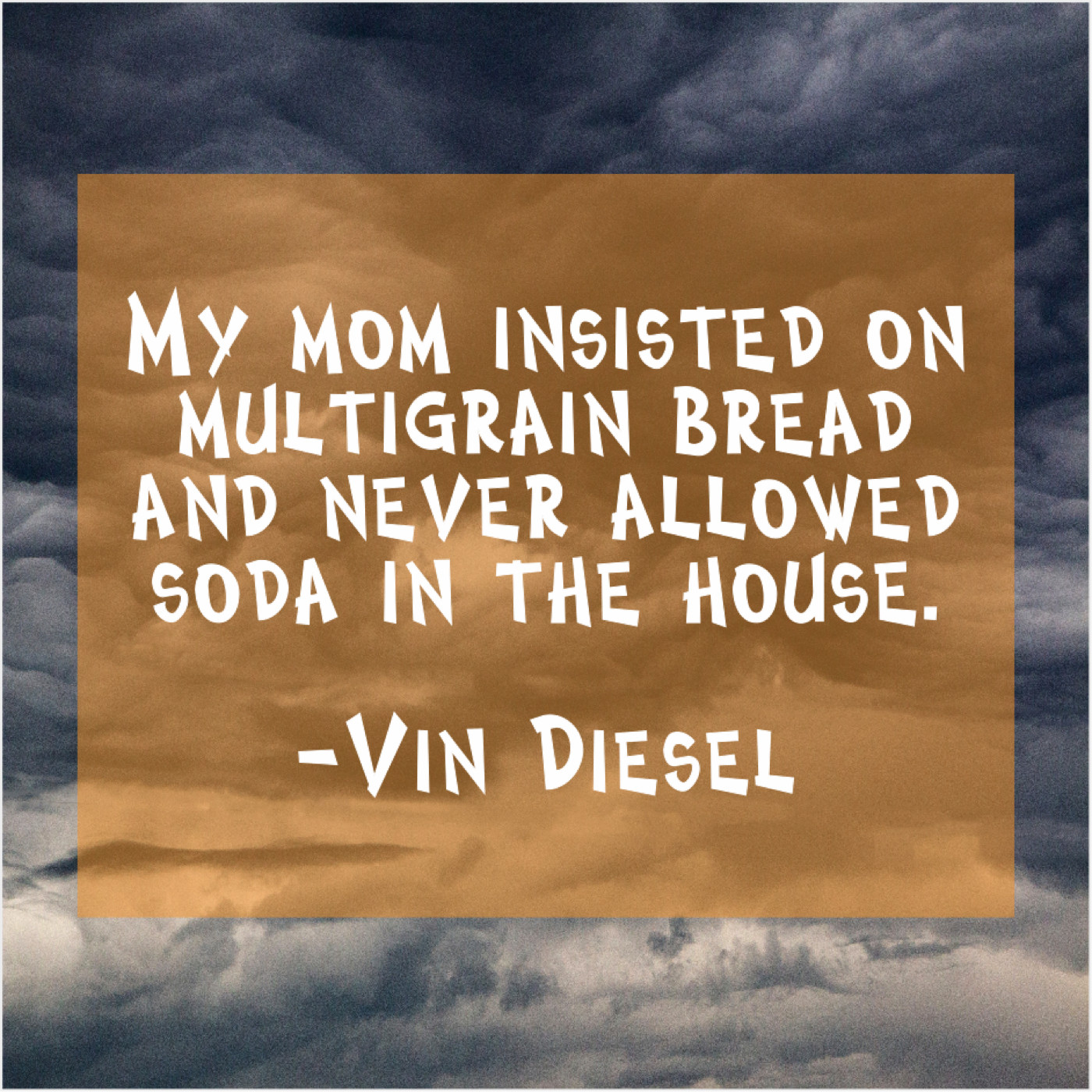 Vin Diesel Vin Diesel – My mom insisted on multigrain… June 2, 2019 admin “My mom insisted on multigrain bread and never allowed soda in the house.”-Vin Diesel