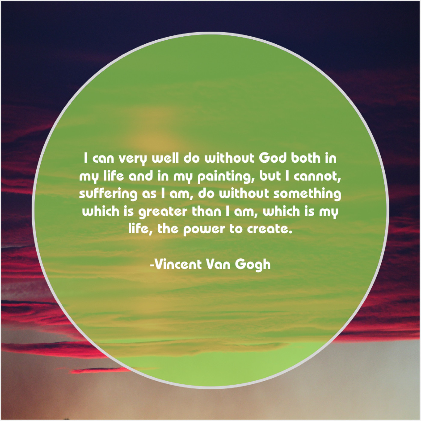 Vincent Van Gogh Vincent Van Gogh – I can very well do… April 9, 2019 admin “I can very well do without God both in my life and in my painting, but I cannot, suffering as I am, do without something which is greater than I am, which is my life, the power to create.”-Vincent Van Gogh