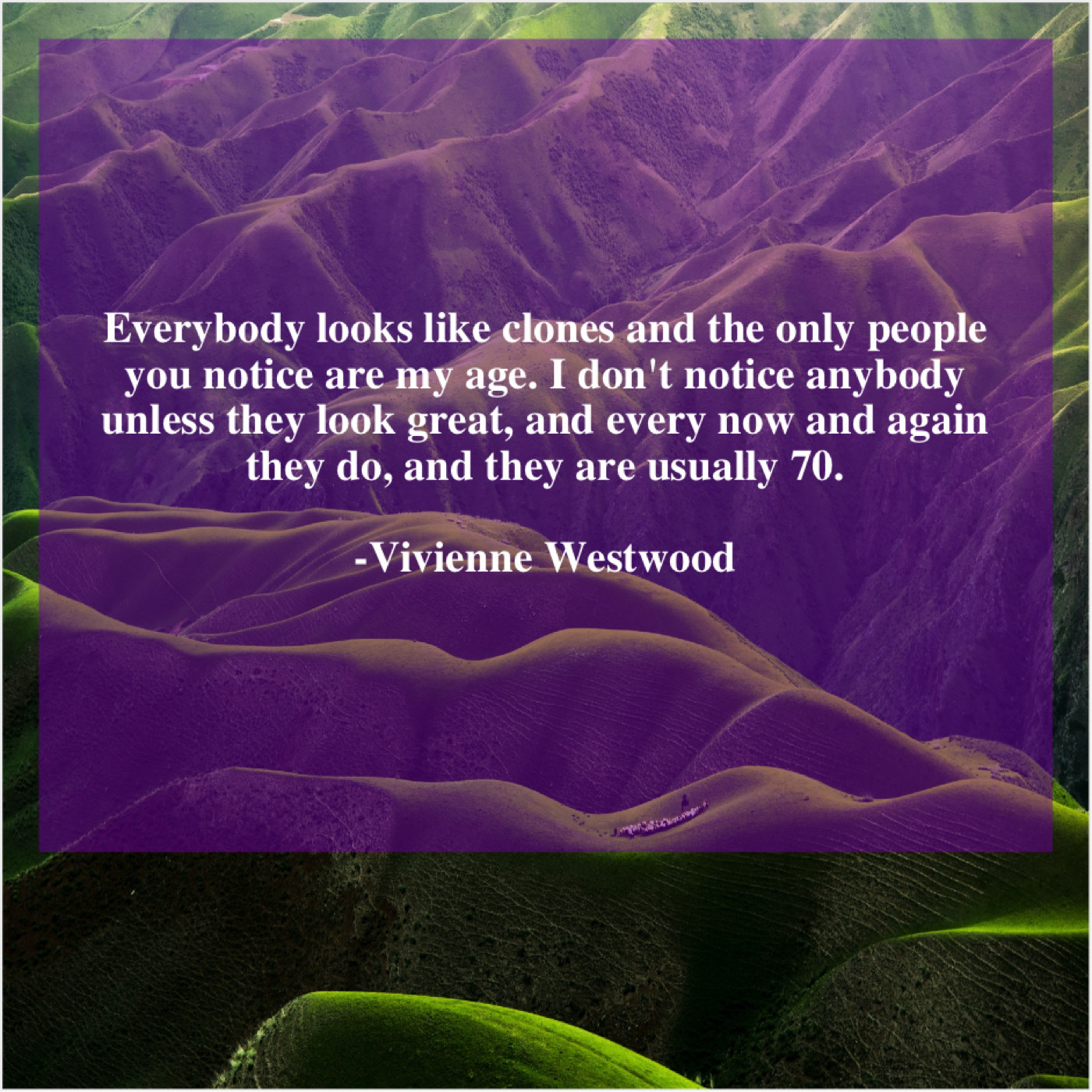 Vivienne Westwood Vivienne Westwood – Everybody looks like clones and… January 27, 2019 admin “Everybody looks like clones and the only people you notice are my age. I don’t notice anybody unless they look great, and every now and again they do, and they are usually 70.”-Vivienne Westwood