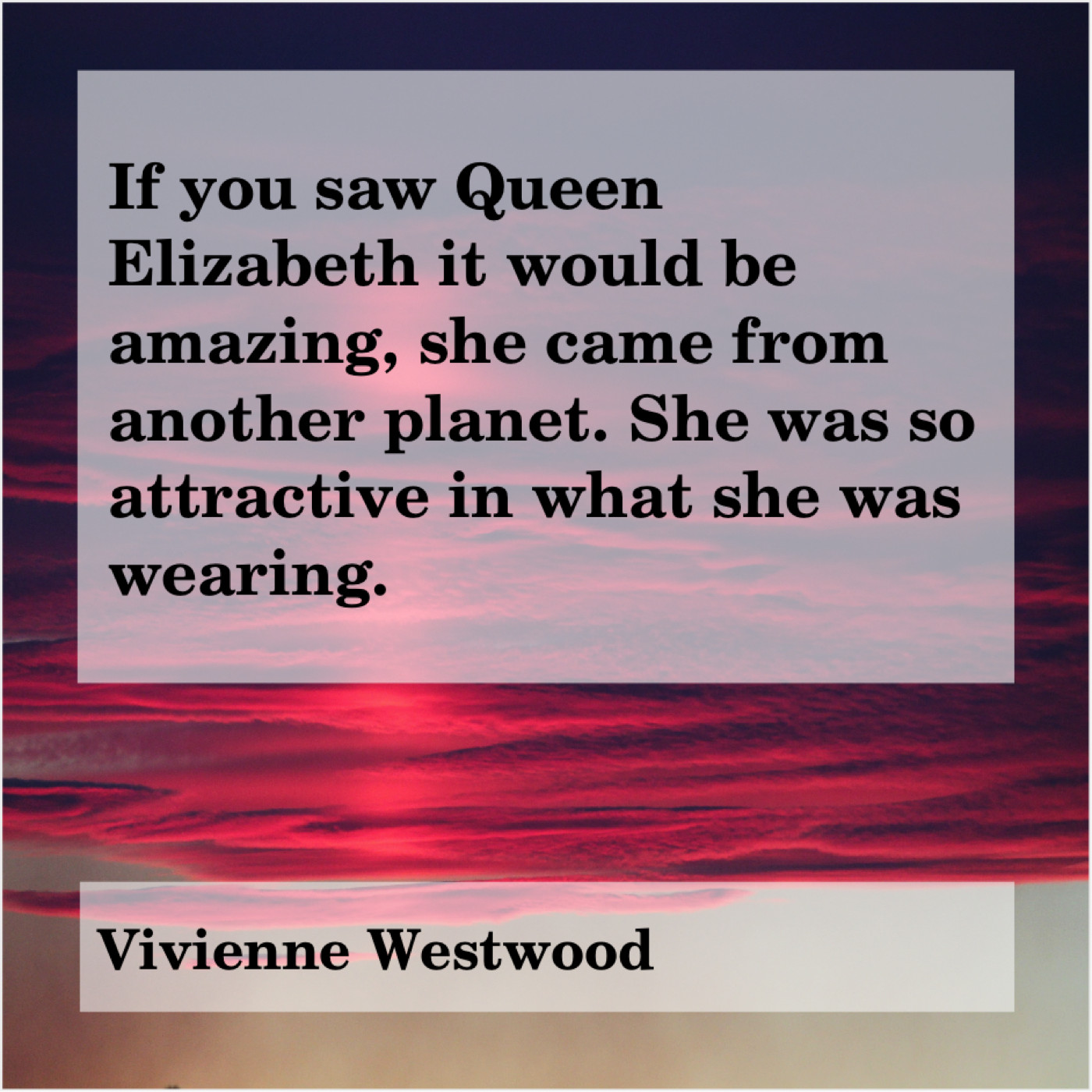 Vivienne Westwood Vivienne Westwood – If you saw Queen Elizabeth… October 16, 2019 admin “If you saw Queen Elizabeth it would be amazing, she came from another planet. She was so attractive in what she was wearing.”-Vivienne Westwood