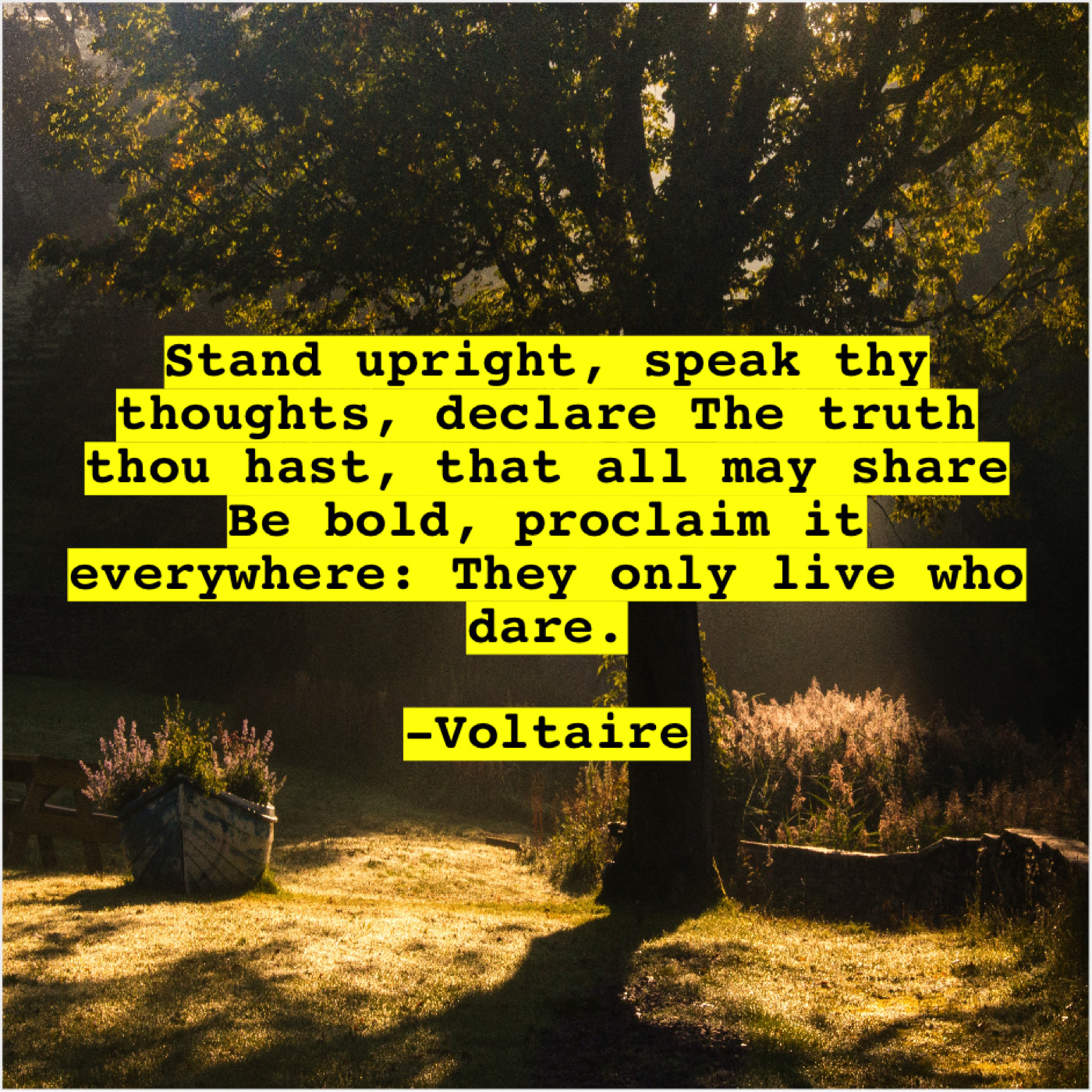 Voltaire Voltaire – Stand upright, speak thy thoughts… June 30, 2019 admin “Stand upright, speak thy thoughts, declare The truth thou hast, that all may share Be bold, proclaim it everywhere: They only live who dare.”-Voltaire