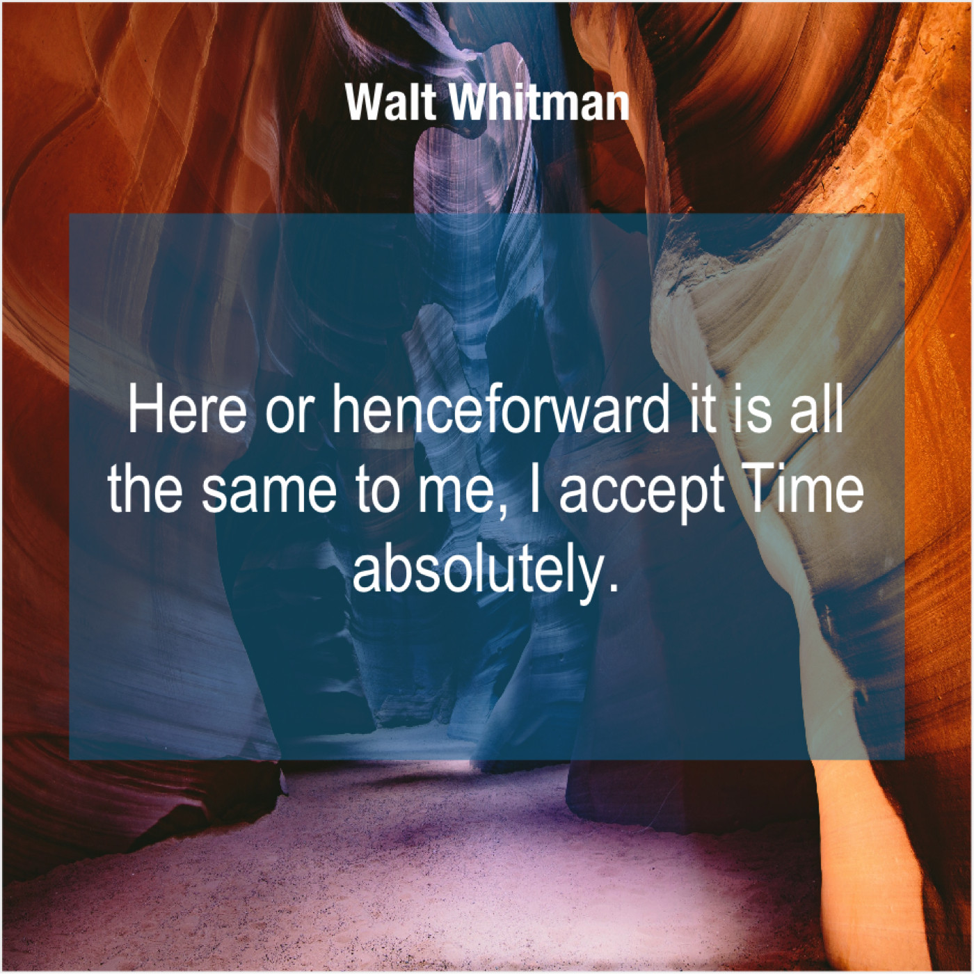 Walt Whitman Walt Whitman – Here or henceforward it is… October 17, 2019 admin “Here or henceforward it is all the same to me, I accept Time absolutely.”-Walt Whitman
