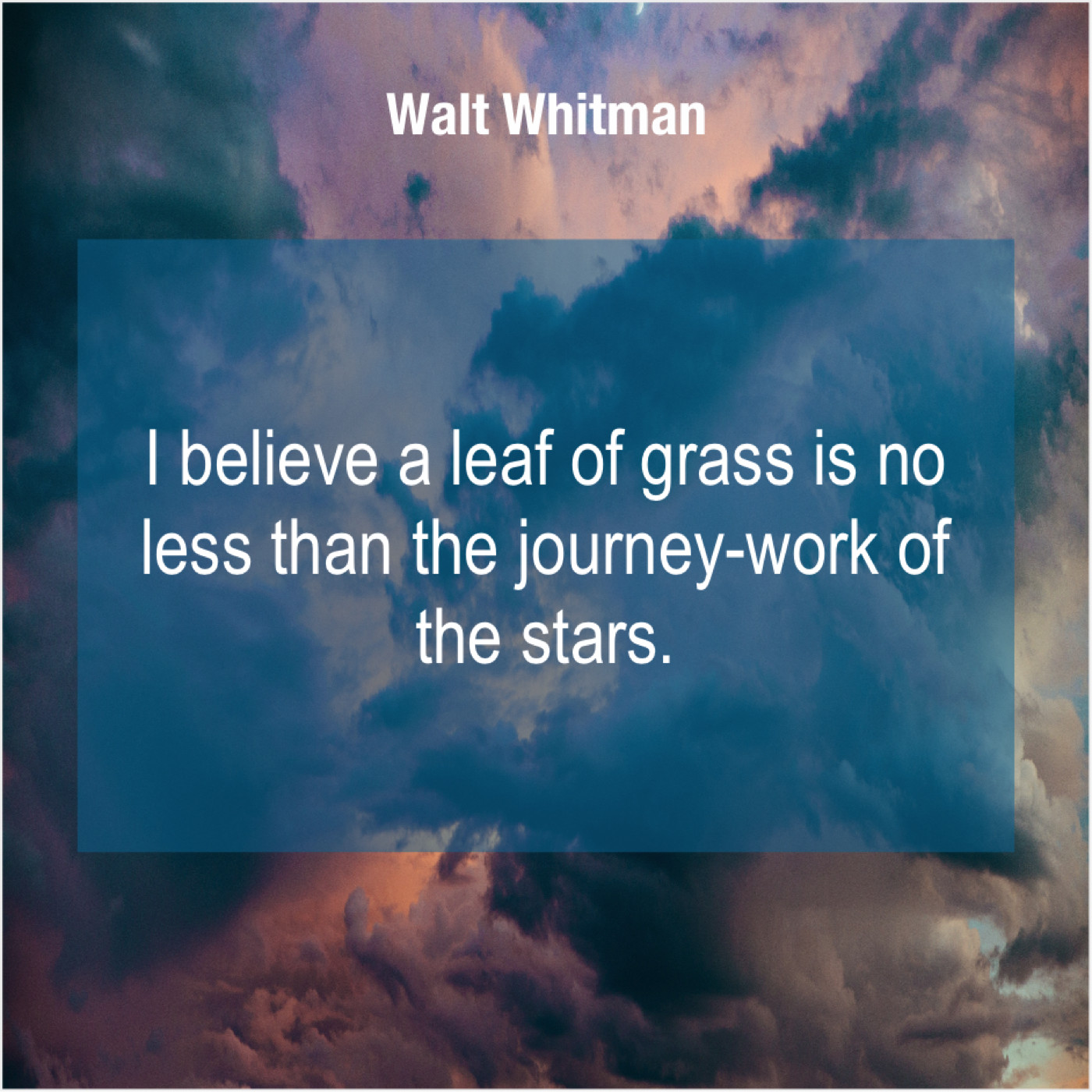 Walt Whitman Walt Whitman – I believe a leaf of… September 13, 2019 admin “I believe a leaf of grass is no less than the journey-work of the stars.”-Walt Whitman