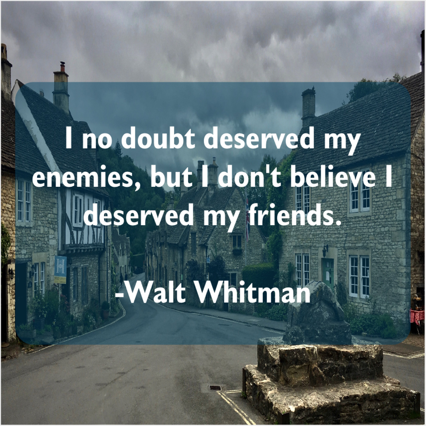 Walt Whitman Walt Whitman – I no doubt deserved my… November 14, 2018 admin “I no doubt deserved my enemies, but I don’t believe I deserved my friends.”-Walt Whitman