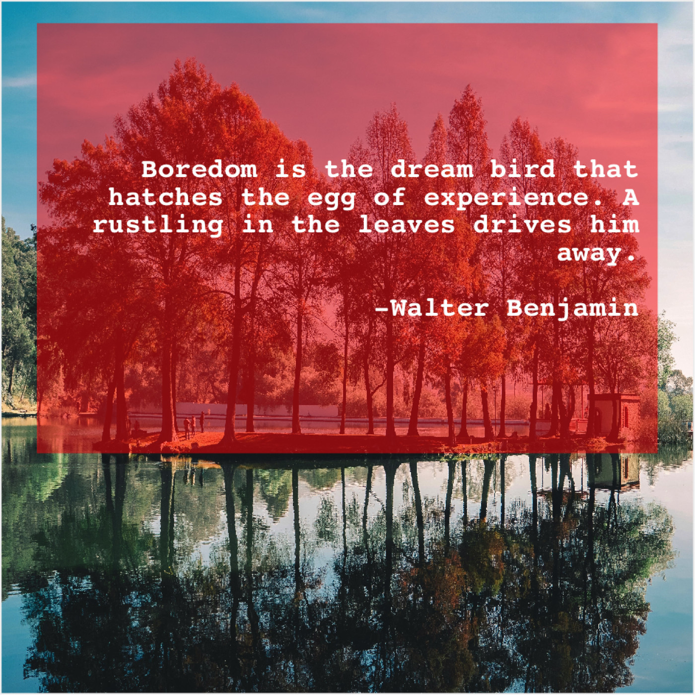 Walter Benjamin Walter Benjamin – Boredom is the dream bird… December 3, 2018 admin “Boredom is the dream bird that hatches the egg of experience. A rustling in the leaves drives him away.”-Walter Benjamin