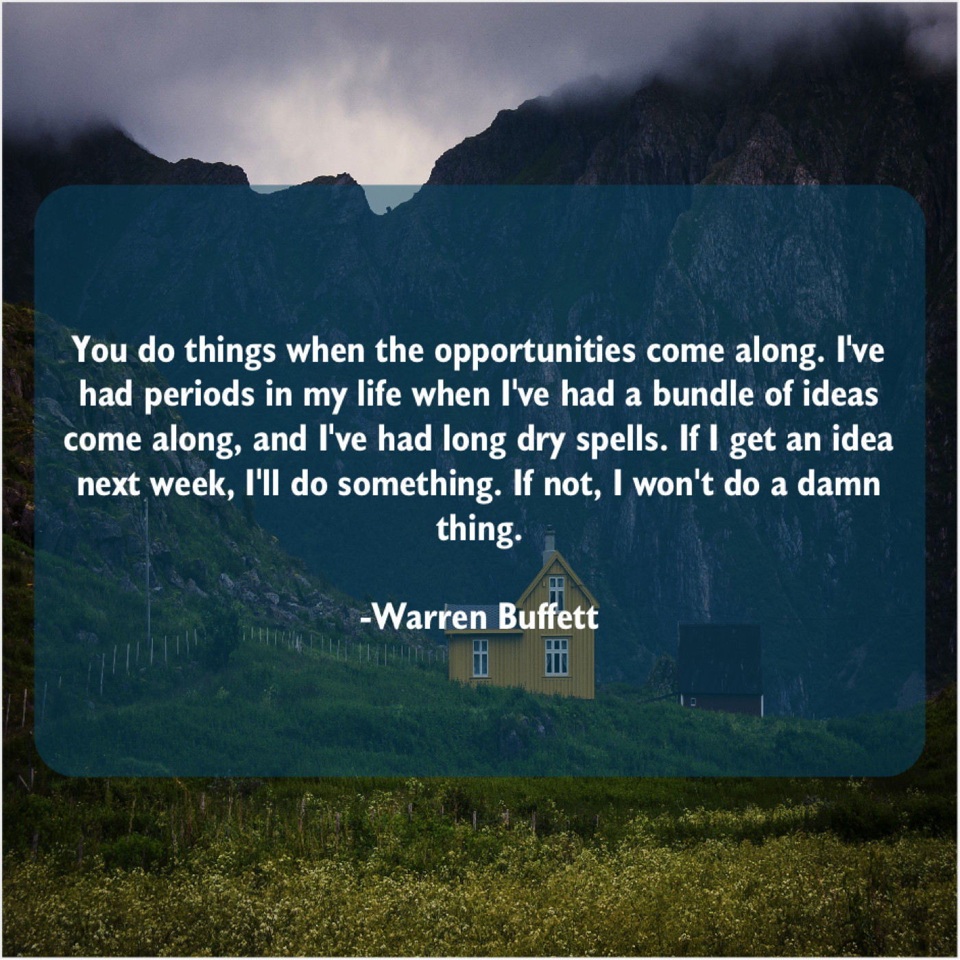 Warren Buffett Warren Buffett – You do things when the… January 30, 2019 admin “You do things when the opportunities come along. I’ve had periods in my life when I’ve had a bundle of ideas come along, and I’ve had long dry spells. If I get an idea next week, I’ll do something. If not, I won’t do a damn thing.”-Warren Buffett