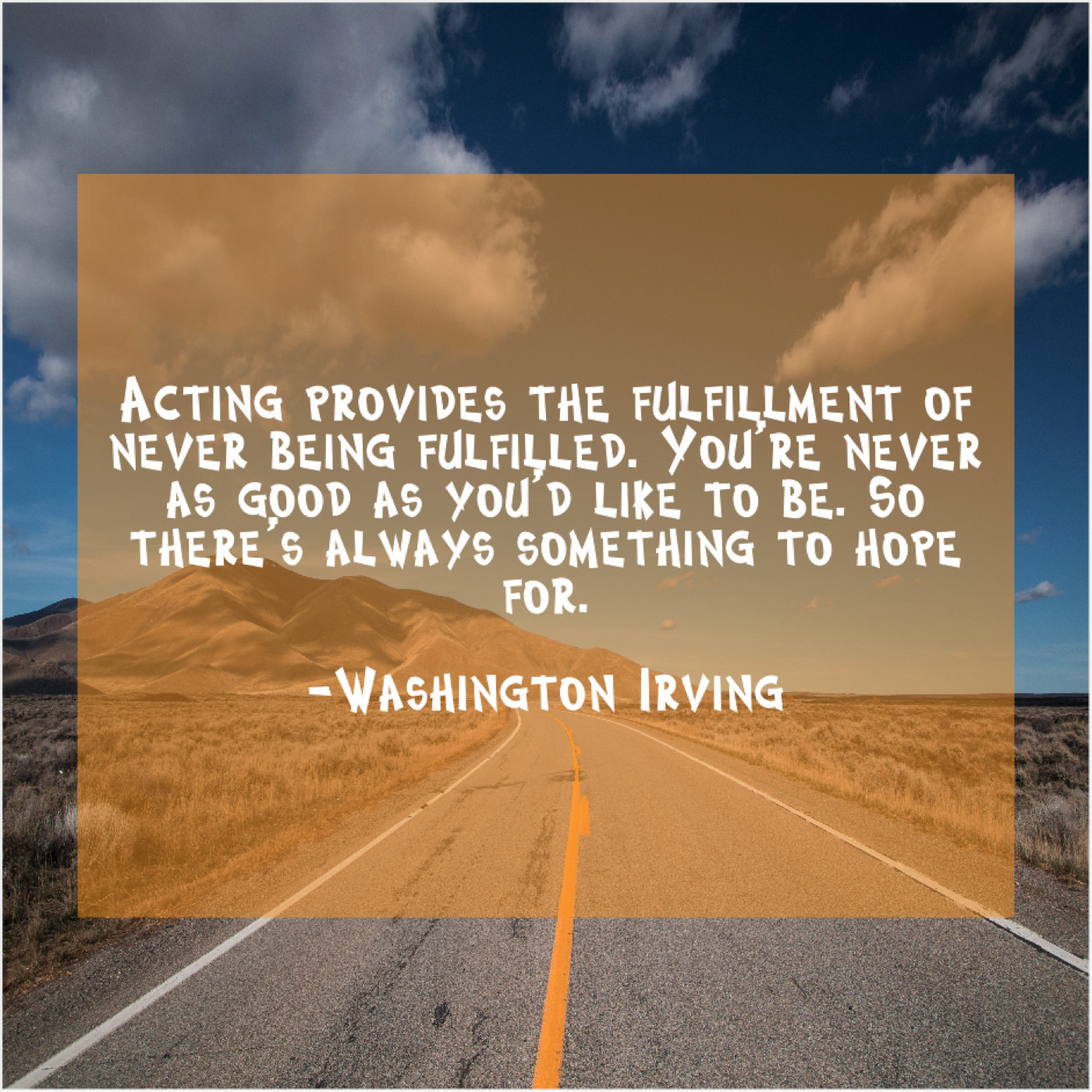 Washington Irving Washington Irving – Acting provides the fulfillment of… July 30, 2019 admin “Acting provides the fulfillment of never being fulfilled. You’re never as good as you’d like to be. So there’s always something to hope for.”-Washington Irving