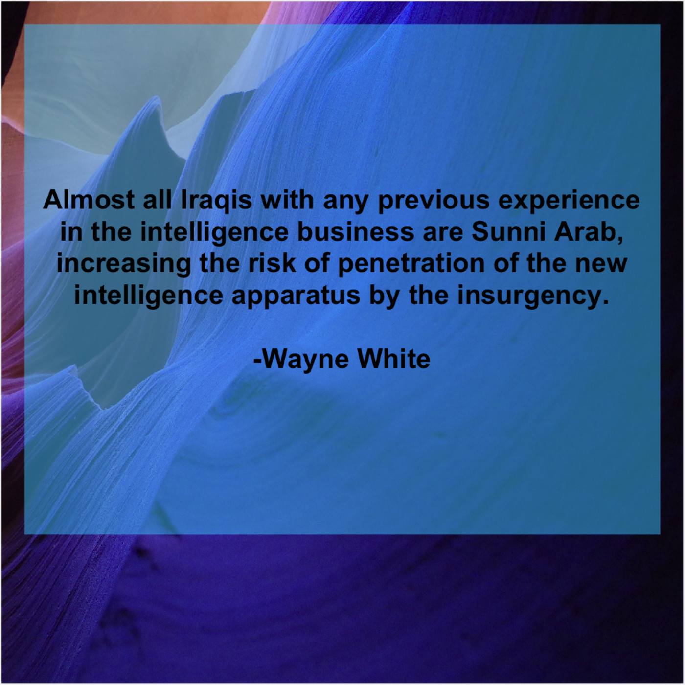 Wayne White Wayne White – Almost all Iraqis with any… September 5, 2019 admin “Almost all Iraqis with any previous experience in the intelligence business are Sunni Arab, increasing the risk of penetration of the new intelligence apparatus by the insurgency.”-Wayne White