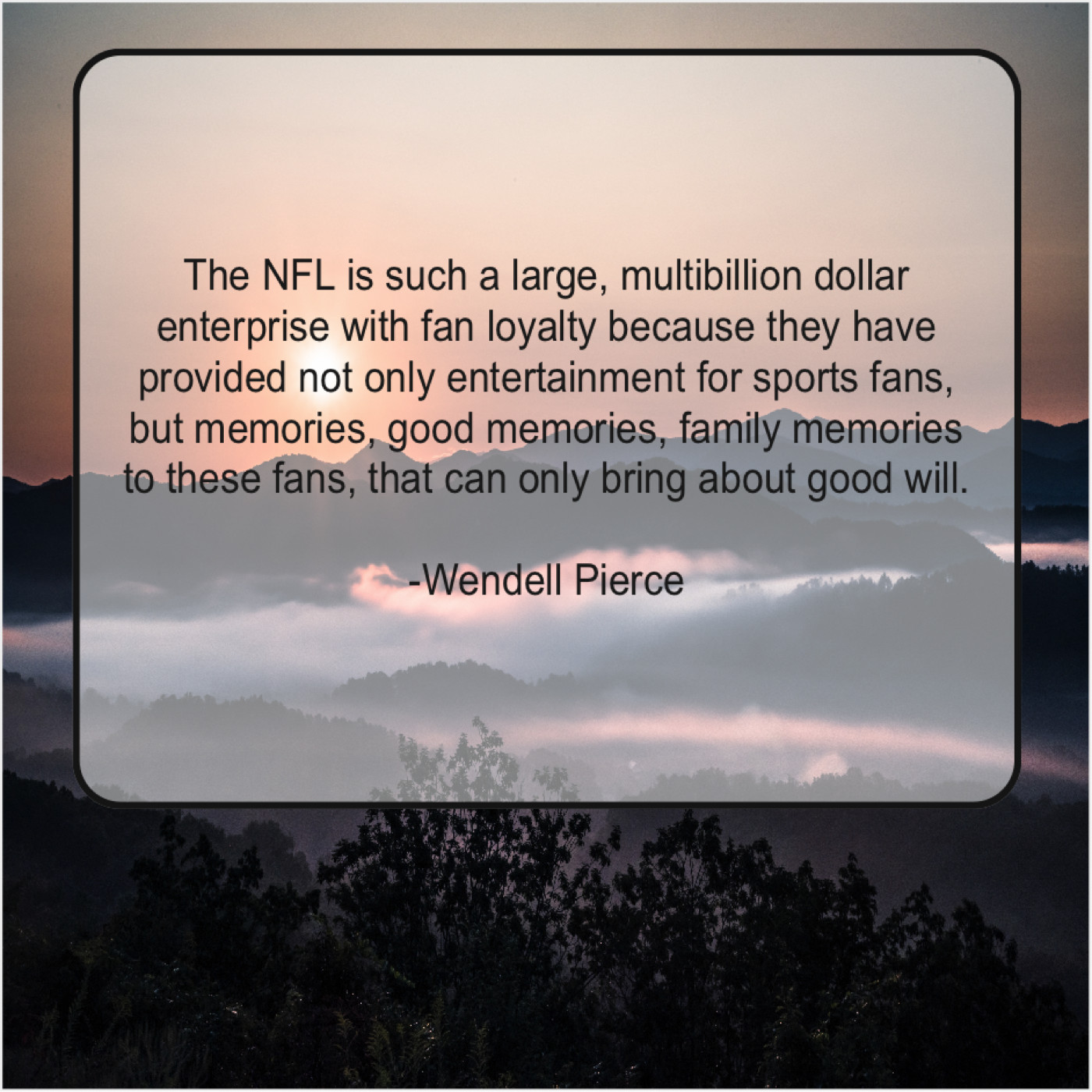 “The NFL is such a large, multibillion dollar enterprise with fan loyalty because they have provided not only entertainment for sports fans, but memories, good memories, family memories to these fans, that can only bring about good will.”