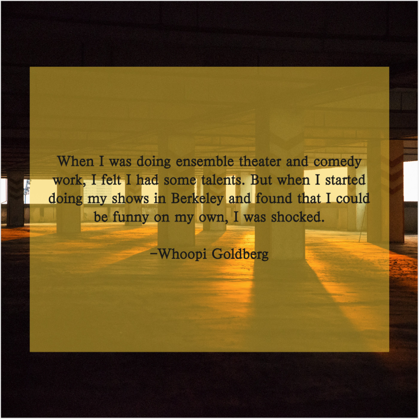 Whoopi Goldberg Whoopi Goldberg – When I was doing ensemble… September 1, 2019 admin “When I was doing ensemble theater and comedy work, I felt I had some talents. But when I started doing my shows in Berkeley and found that I could be funny on my own, I was shocked.”-Whoopi Goldberg