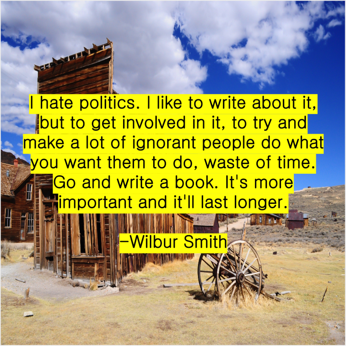 Wilbur Smith Wilbur Smith – I hate politics. I like… August 11, 2019 admin “I hate politics. I like to write about it, but to get involved in it, to try and make a lot of ignorant people do what you want them to do, waste of time. Go and write a book. It’s more important and it’ll last longer.”-Wilbur Smith