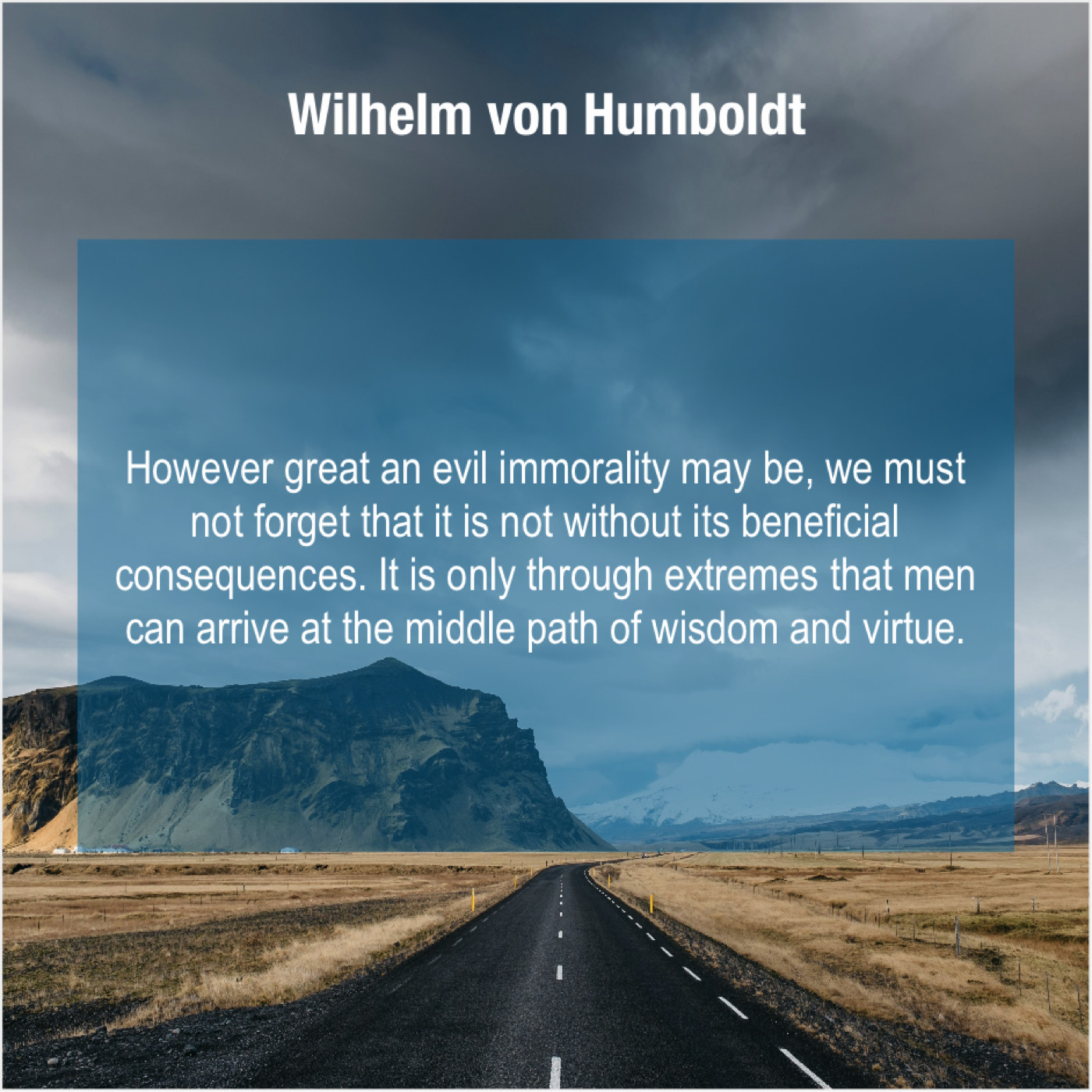 Wilhelm von Humboldt Wilhelm von Humboldt – However great an evil immorality… May 4, 2019 admin “However great an evil immorality may be, we must not forget that it is not without its beneficial consequences. It is only through extremes that men can arrive at the middle path of wisdom and virtue.”-Wilhelm von Humboldt