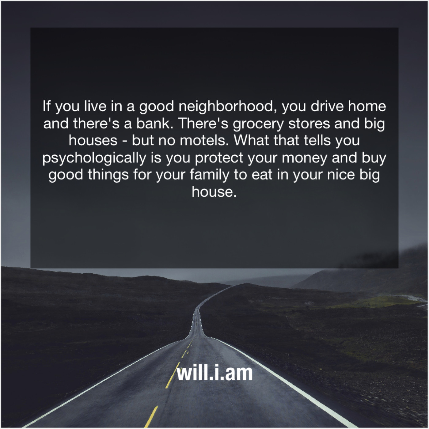 “If you live in a good neighborhood, you drive home and there’s a bank. There’s grocery stores and big houses – but no motels. What that tells you psychologically is you protect your money and buy good things for your family to eat in your nice big house.”