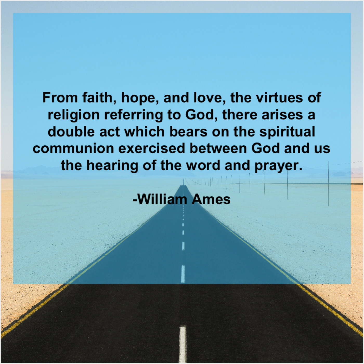 William Ames William Ames – From faith, hope, and love… December 23, 2018 admin “From faith, hope, and love, the virtues of religion referring to God, there arises a double act which bears on the spiritual communion exercised between God and us the hearing of the word and prayer.”-William Ames