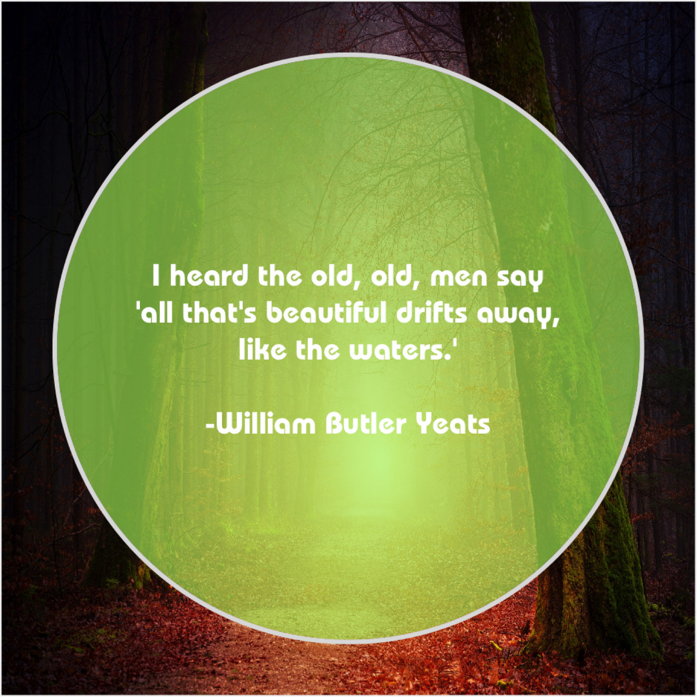 William Butler Yeats William Butler Yeats – I heard the old, old… April 9, 2019 admin “I heard the old, old, men say ‘all that’s beautiful drifts away, like the waters.'”-William Butler Yeats