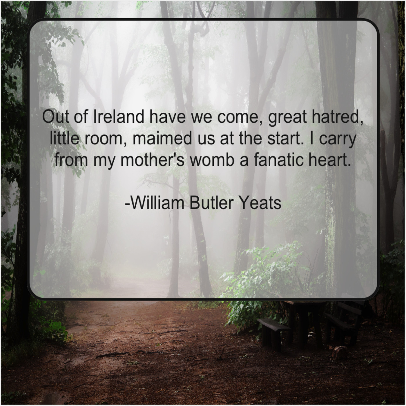 William Butler Yeats William Butler Yeats – Out of Ireland have we… June 22, 2019 admin “Out of Ireland have we come, great hatred, little room, maimed us at the start. I carry from my mother’s womb a fanatic heart.”-William Butler Yeats