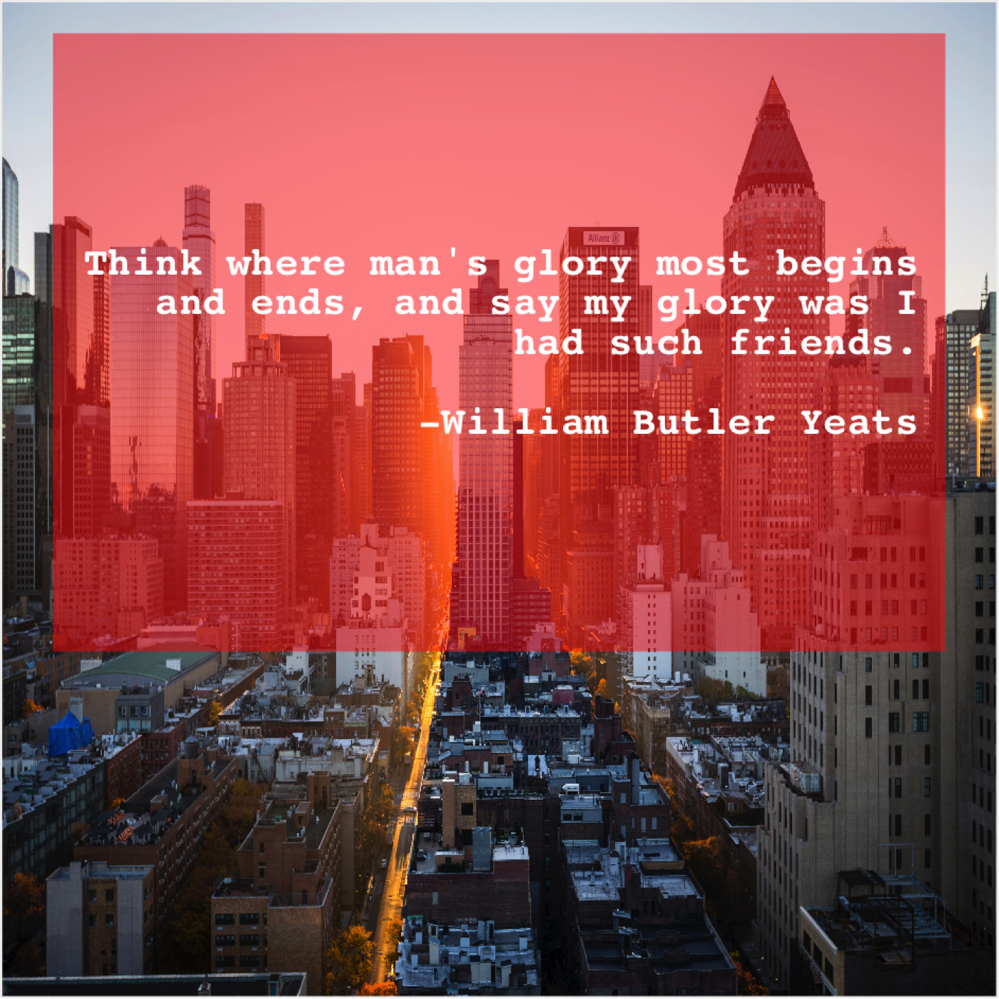 William Butler Yeats William Butler Yeats – Think where man’s glory most… September 2, 2019 admin “Think where man’s glory most begins and ends, and say my glory was I had such friends.”-William Butler Yeats
