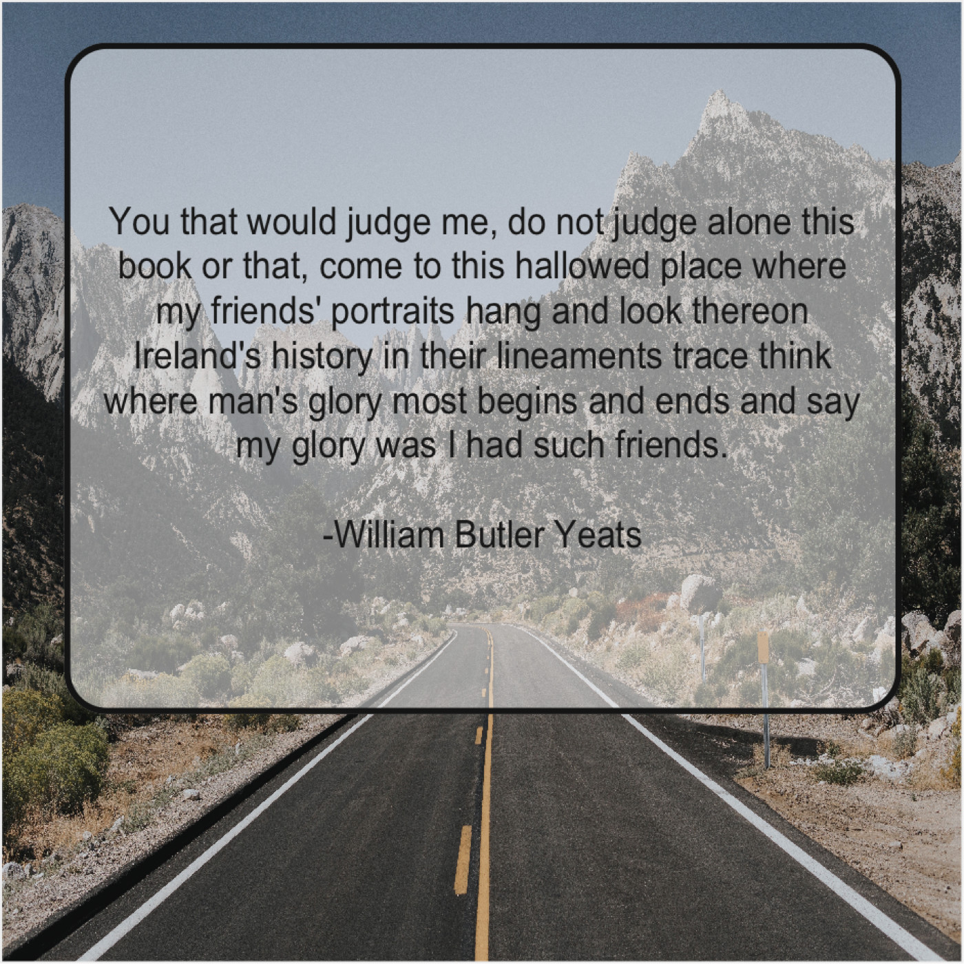 “You that would judge me, do not judge alone this book or that, come to this hallowed place where my friends’ portraits hang and look thereon Ireland’s history in their lineaments trace think where man’s glory most begins and ends and say my glory was I had such friends.”