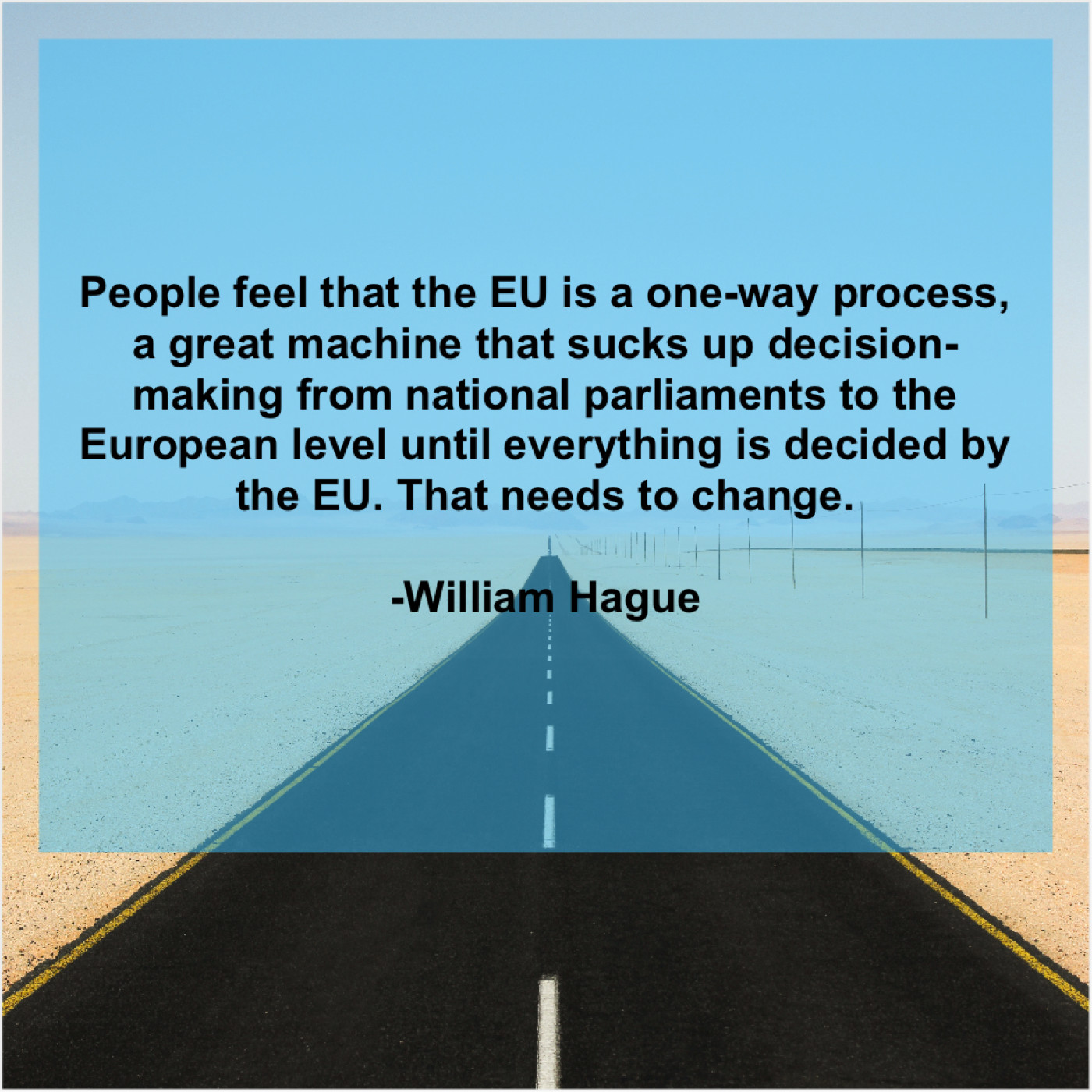 William Hague William Hague – People feel that the EU… September 19, 2019 admin “People feel that the EU is a one-way process, a great machine that sucks up decision-making from national parliaments to the European level until everything is decided by the EU. That needs to change.”-William Hague