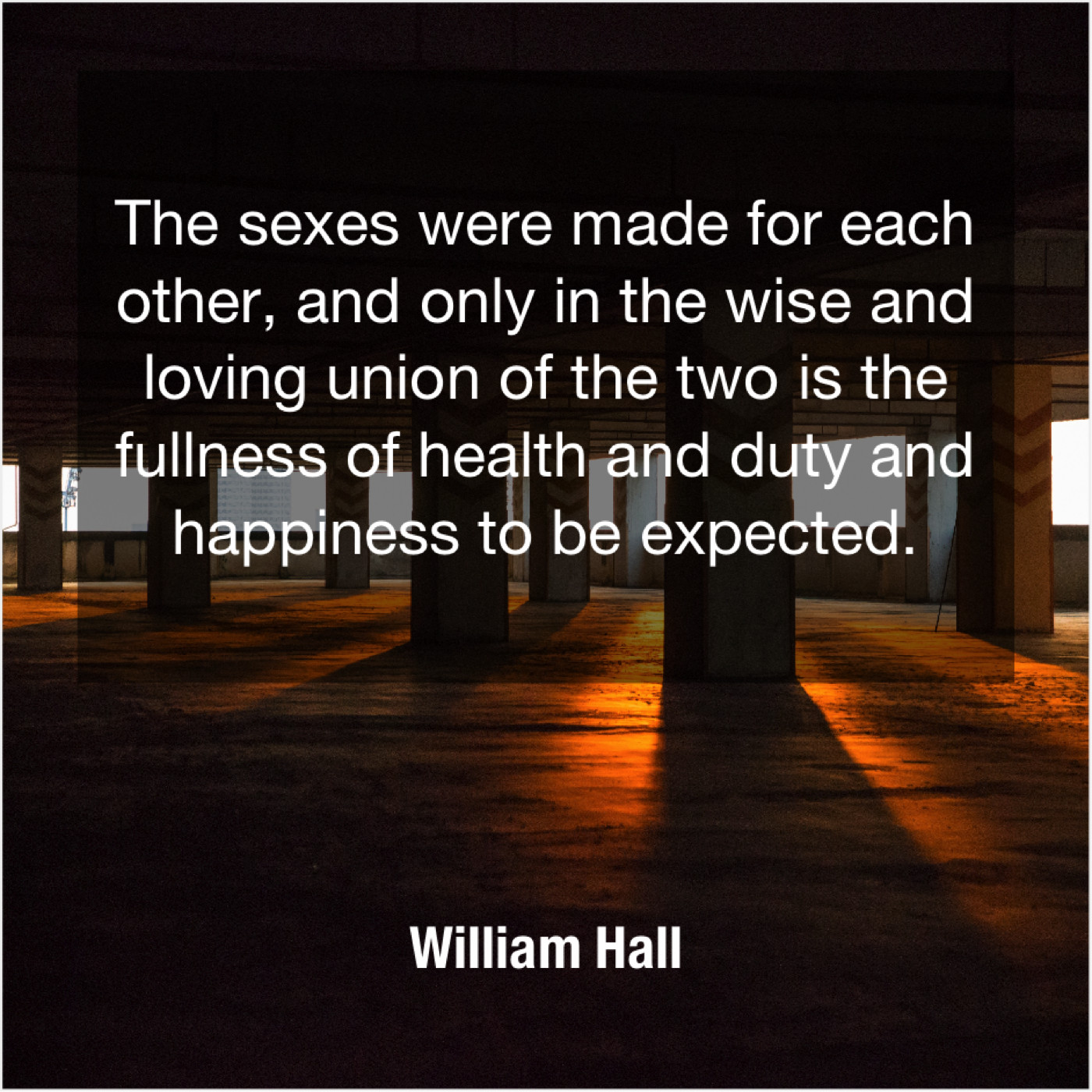 William Hall William Hall – The sexes were made for… April 5, 2019 admin “The sexes were made for each other, and only in the wise and loving union of the two is the fullness of health and duty and happiness to be expected.”-William Hall