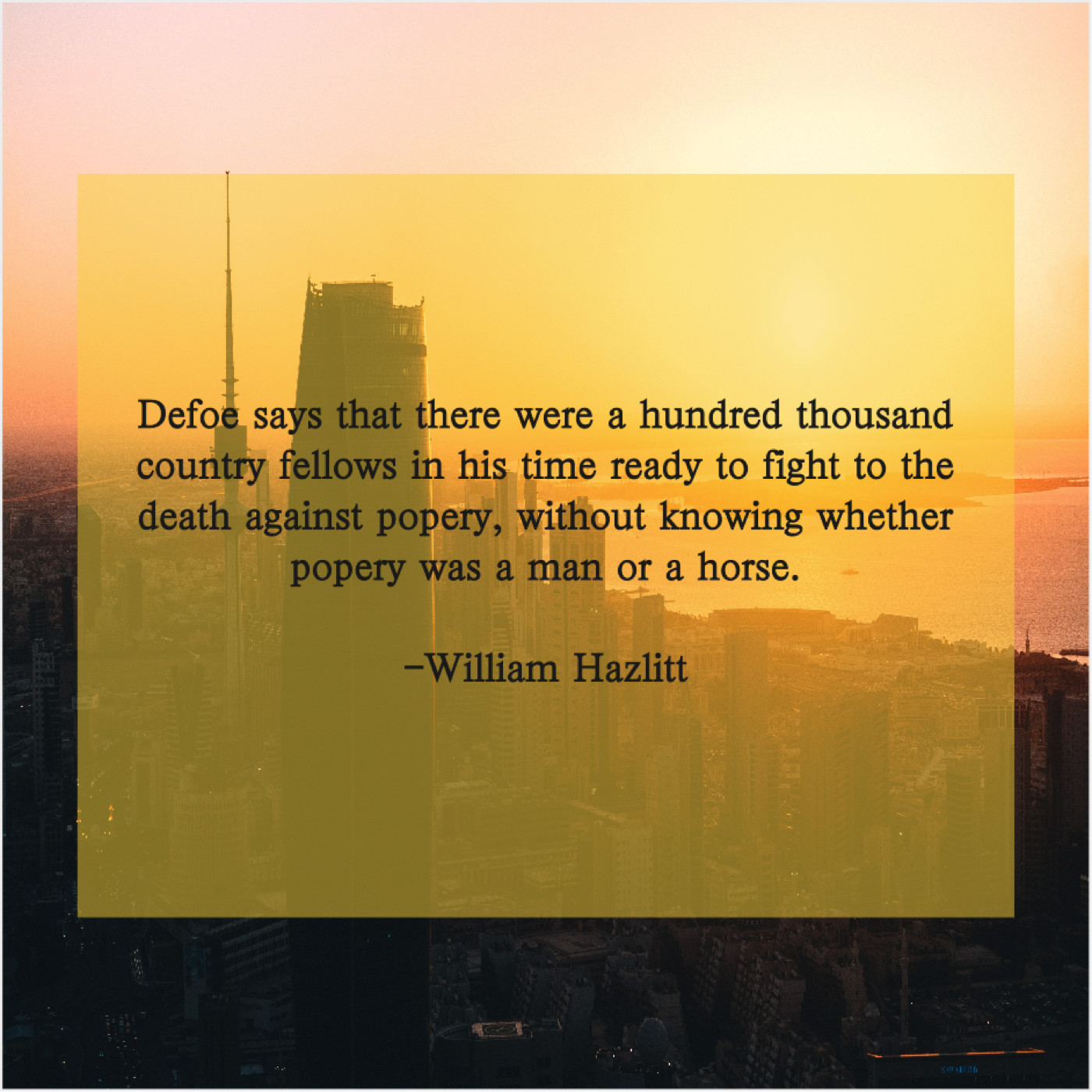 William Hazlitt William Hazlitt – Defoe says that there were… March 25, 2019 admin “Defoe says that there were a hundred thousand country fellows in his time ready to fight to the death against popery, without knowing whether popery was a man or a horse.”-William Hazlitt