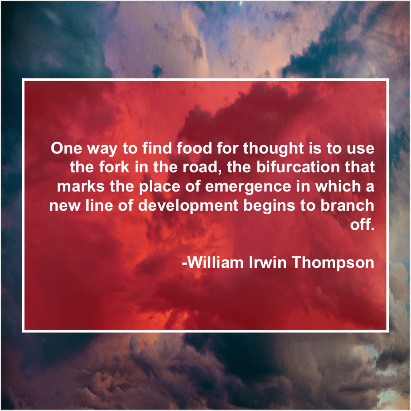 William Irwin Thompson William Irwin Thompson – One way to find food… November 23, 2018 admin “One way to find food for thought is to use the fork in the road, the bifurcation that marks the place of emergence in which a new line of development begins to branch off.”-William Irwin Thompson