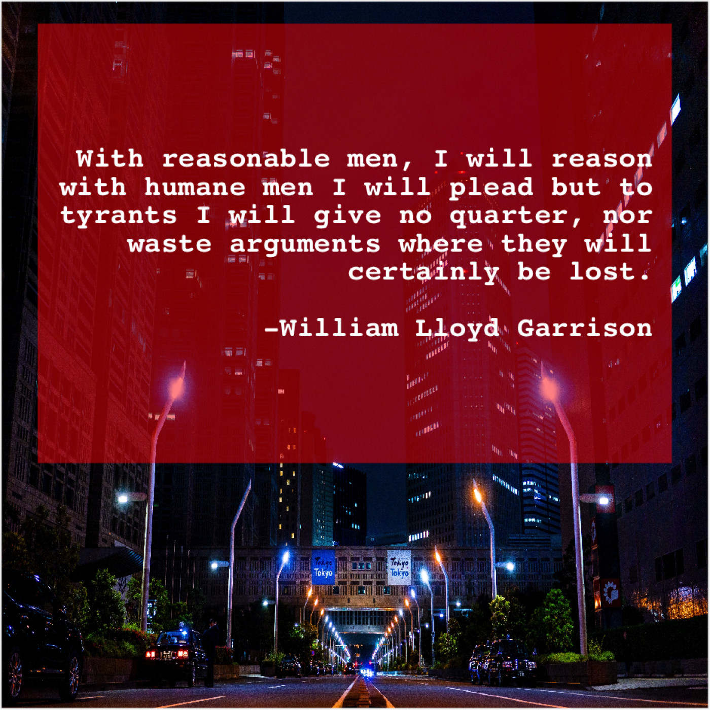 William Lloyd Garrison William Lloyd Garrison – With reasonable men, I will… April 18, 2019 admin “With reasonable men, I will reason with humane men I will plead but to tyrants I will give no quarter, nor waste arguments where they will certainly be lost.”-William Lloyd Garrison
