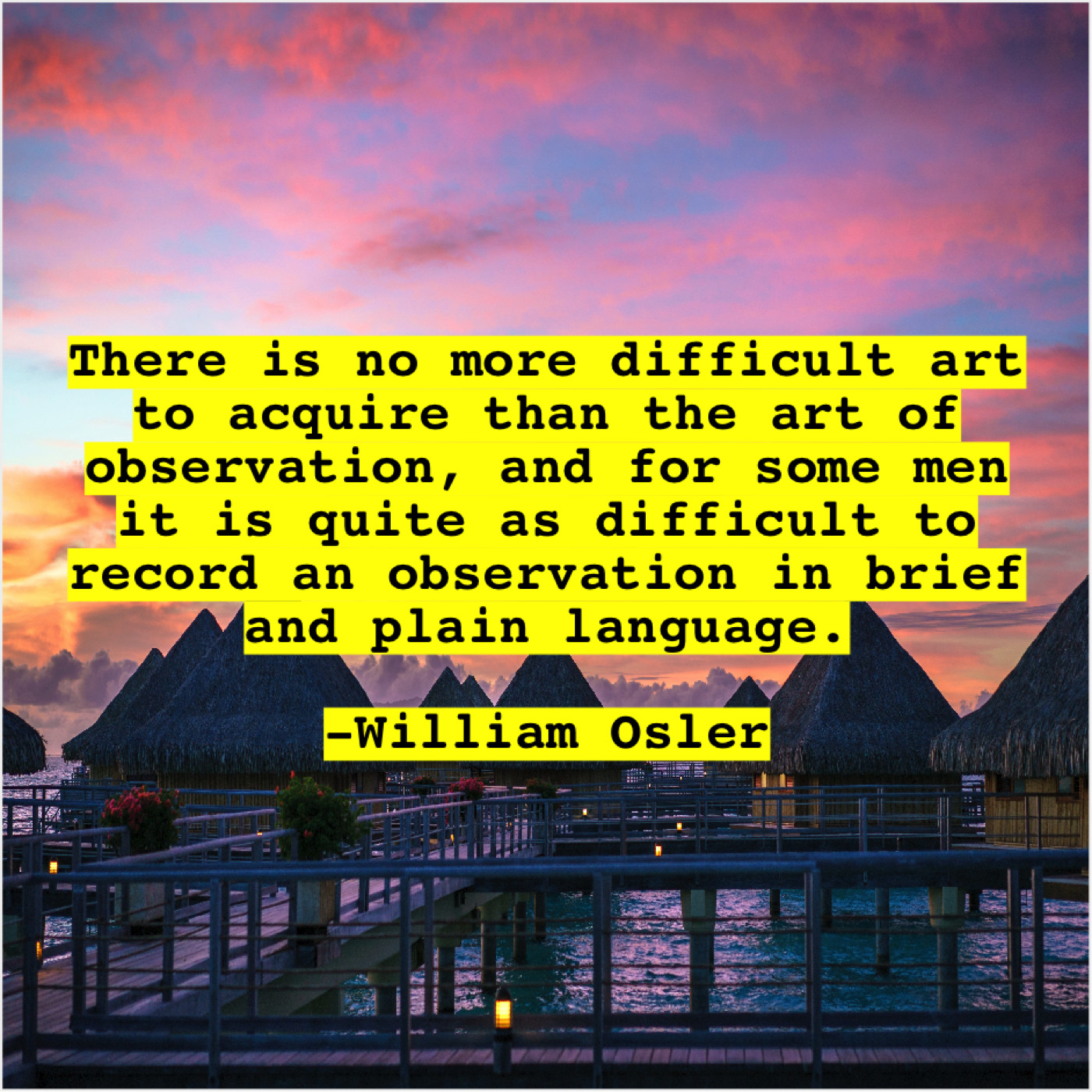 William Osler William Osler – There is no more difficult… February 14, 2019 admin “There is no more difficult art to acquire than the art of observation, and for some men it is quite as difficult to record an observation in brief and plain language.”-William Osler