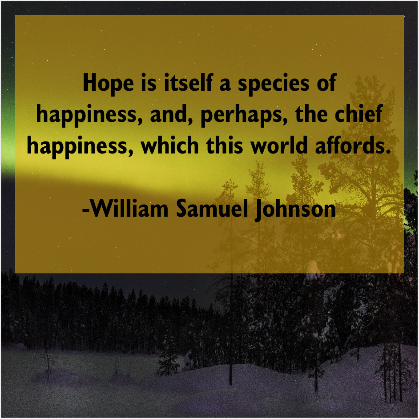 William Samuel Johnson William Samuel Johnson – Hope is itself a species… June 23, 2019 admin “Hope is itself a species of happiness, and, perhaps, the chief happiness, which this world affords.”-William Samuel Johnson