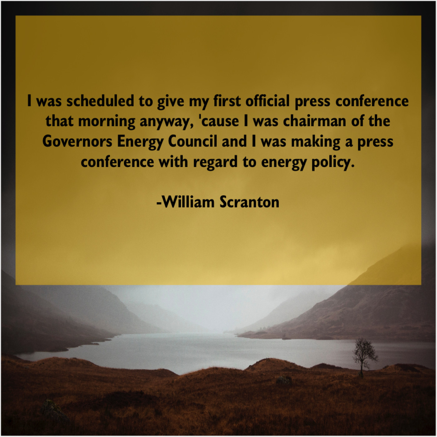 William Scranton William Scranton – I was scheduled to give… October 15, 2019 admin “I was scheduled to give my first official press conference that morning anyway, ’cause I was chairman of the Governors Energy Council and I was making a press conference with regard to energy policy.”-William Scranton