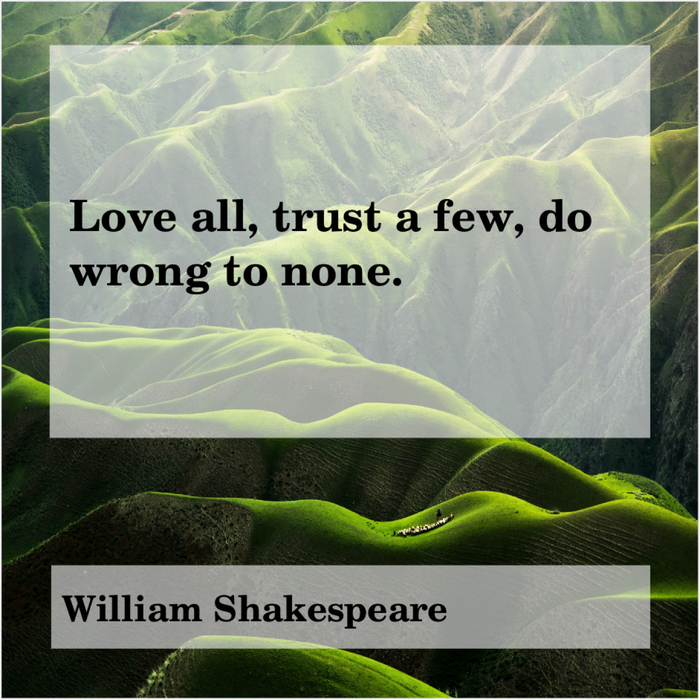 William Shakespeare William Shakespeare – Love all, trust a few… April 9, 2019 admin “Love all, trust a few, do wrong to none.”-William Shakespeare
