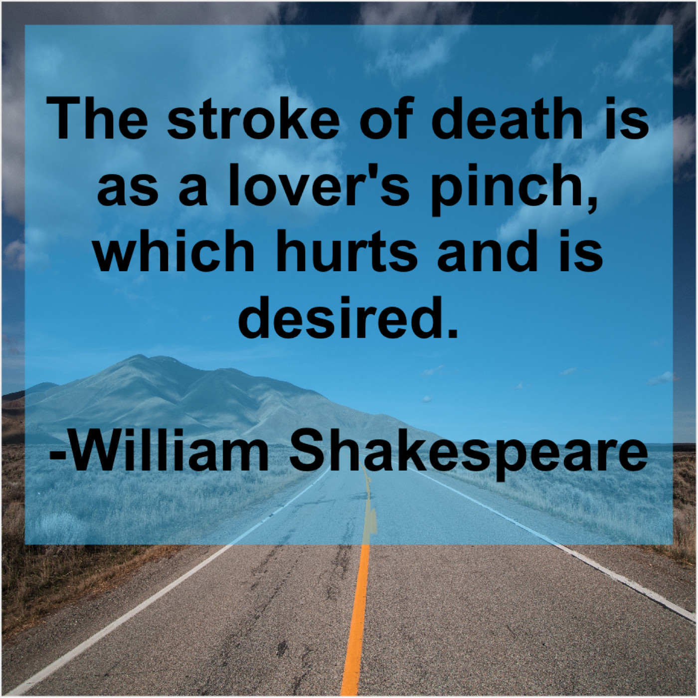William Shakespeare William Shakespeare – The stroke of death is… September 30, 2019 admin “The stroke of death is as a lover’s pinch, which hurts and is desired.”-William Shakespeare