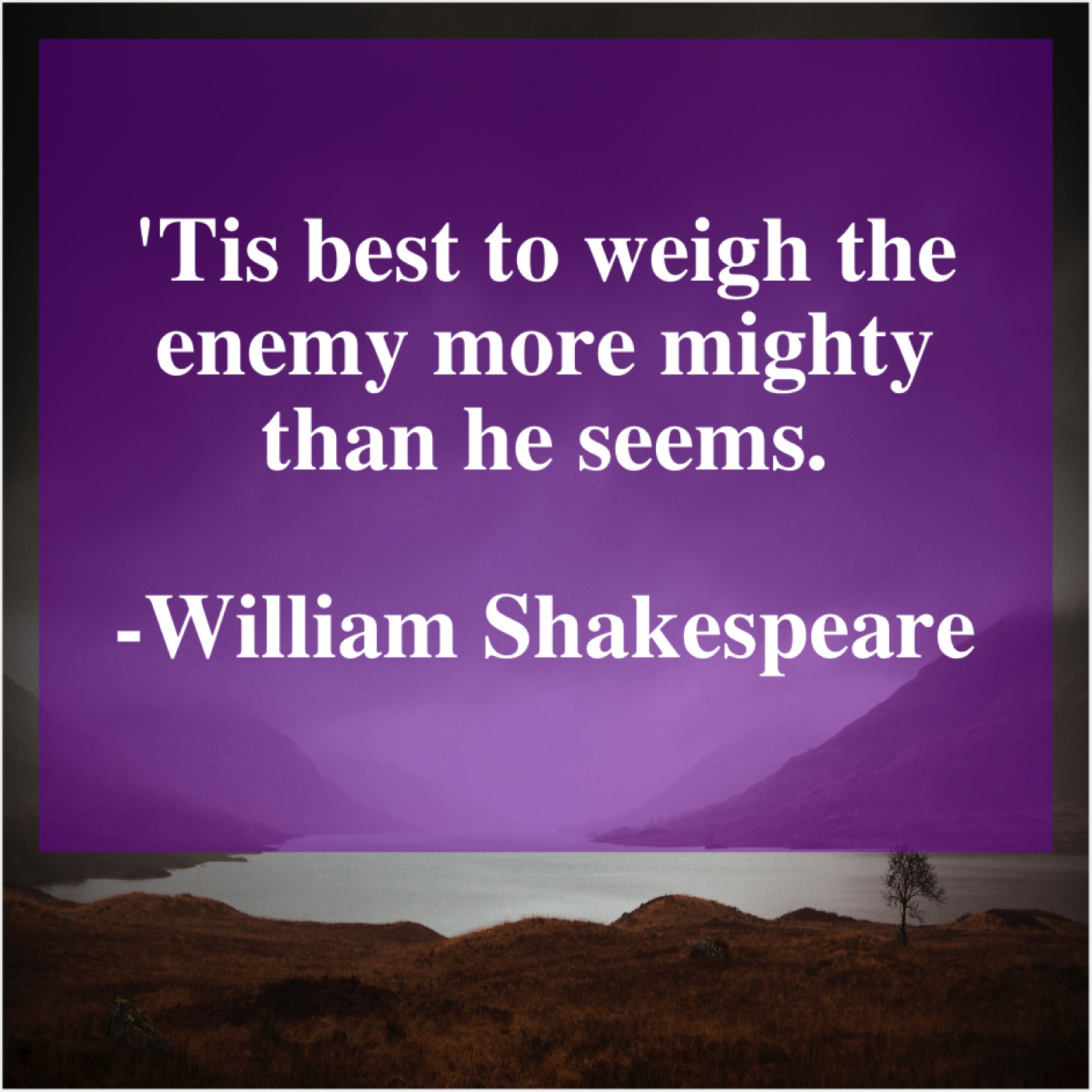 William Shakespeare William Shakespeare – Tis best to weigh the… October 4, 2019 admin “‘Tis best to weigh the enemy more mighty than he seems.”-William Shakespeare