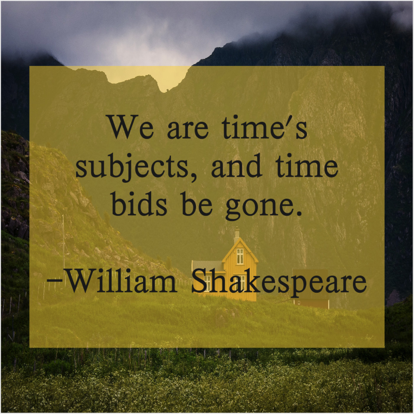 William Shakespeare William Shakespeare – We are time’s subjects, and… July 18, 2019 admin “We are time’s subjects, and time bids be gone.”-William Shakespeare