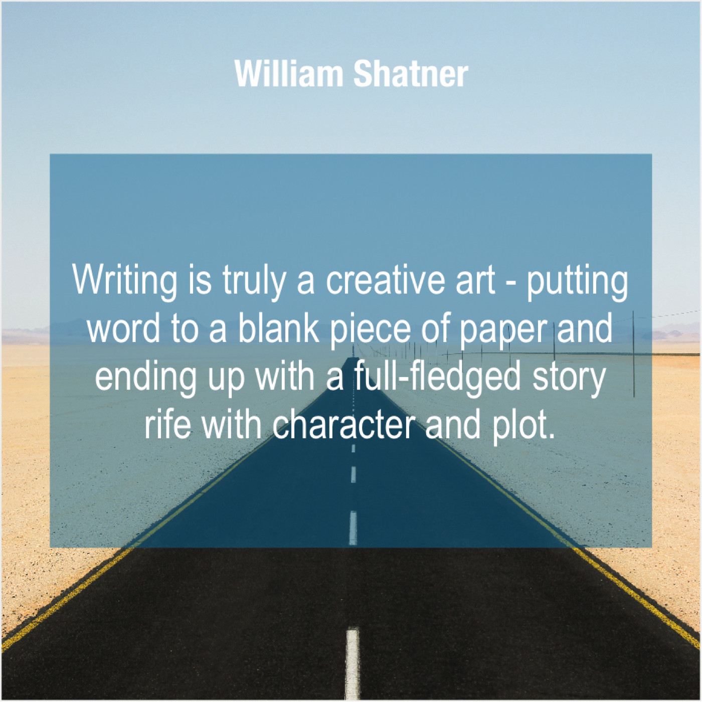 William Shatner William Shatner – Writing is truly a creative… January 19, 2019 admin “Writing is truly a creative art – putting word to a blank piece of paper and ending up with a full-fledged story rife with character and plot.”-William Shatner