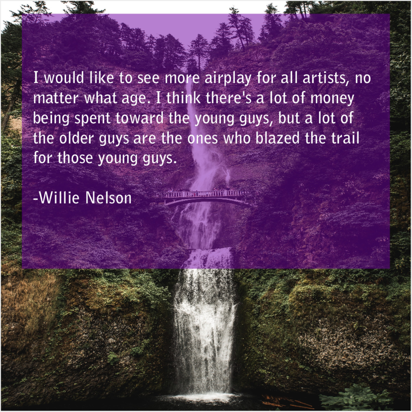 Willie Nelson Willie Nelson – I would like to see… January 28, 2019 admin “I would like to see more airplay for all artists, no matter what age. I think there’s a lot of money being spent toward the young guys, but a lot of the older guys are the ones who blazed the trail for those young guys.”-Willie Nelson
