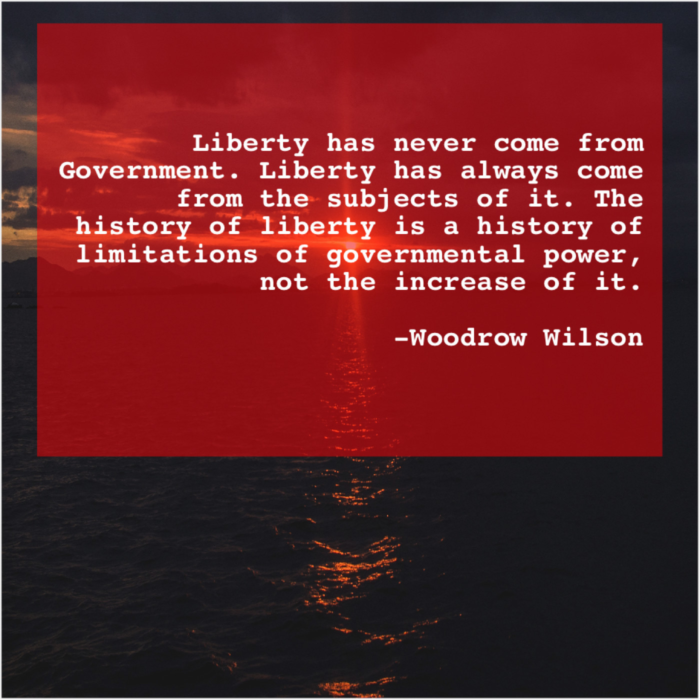 Woodrow Wilson Woodrow Wilson – Liberty has never come from… December 27, 2018 admin “Liberty has never come from Government. Liberty has always come from the subjects of it. The history of liberty is a history of limitations of governmental power, not the increase of it.”-Woodrow Wilson