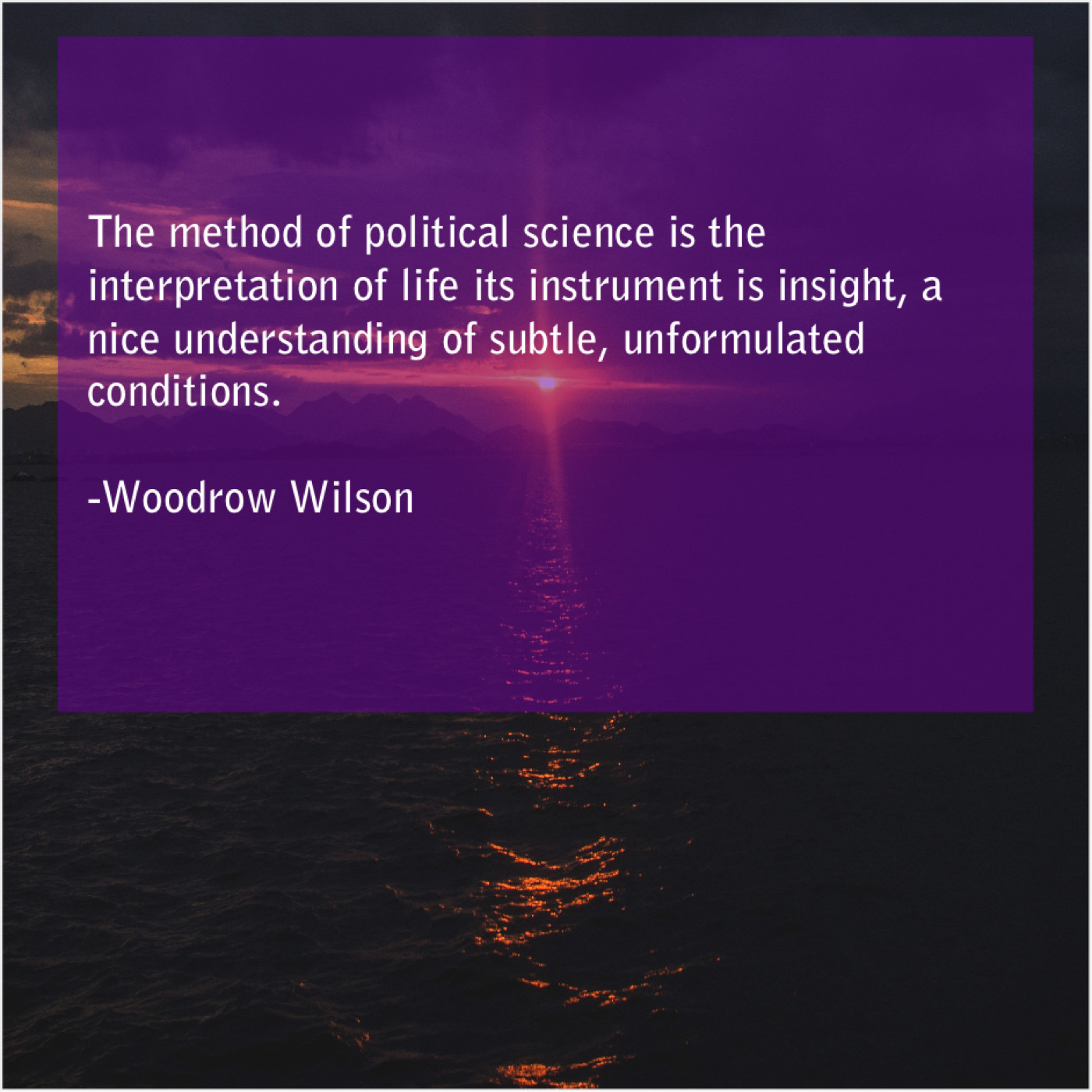 Woodrow Wilson Woodrow Wilson – The method of political science… August 16, 2019 admin “The method of political science is the interpretation of life its instrument is insight, a nice understanding of subtle, unformulated conditions.”-Woodrow Wilson