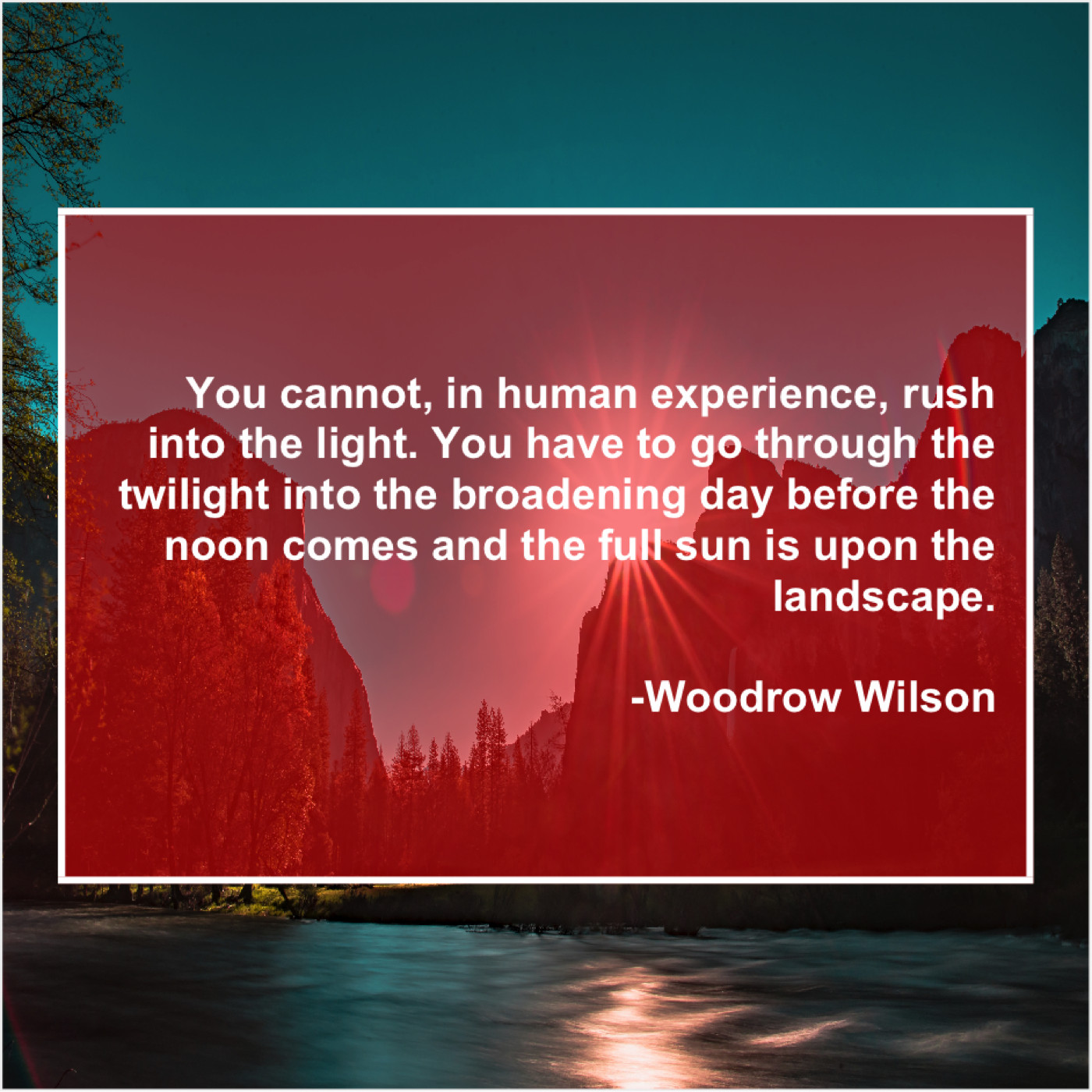 Woodrow Wilson Woodrow Wilson – You cannot, in human experience… September 2, 2019 admin “You cannot, in human experience, rush into the light. You have to go through the twilight into the broadening day before the noon comes and the full sun is upon the landscape.”-Woodrow Wilson