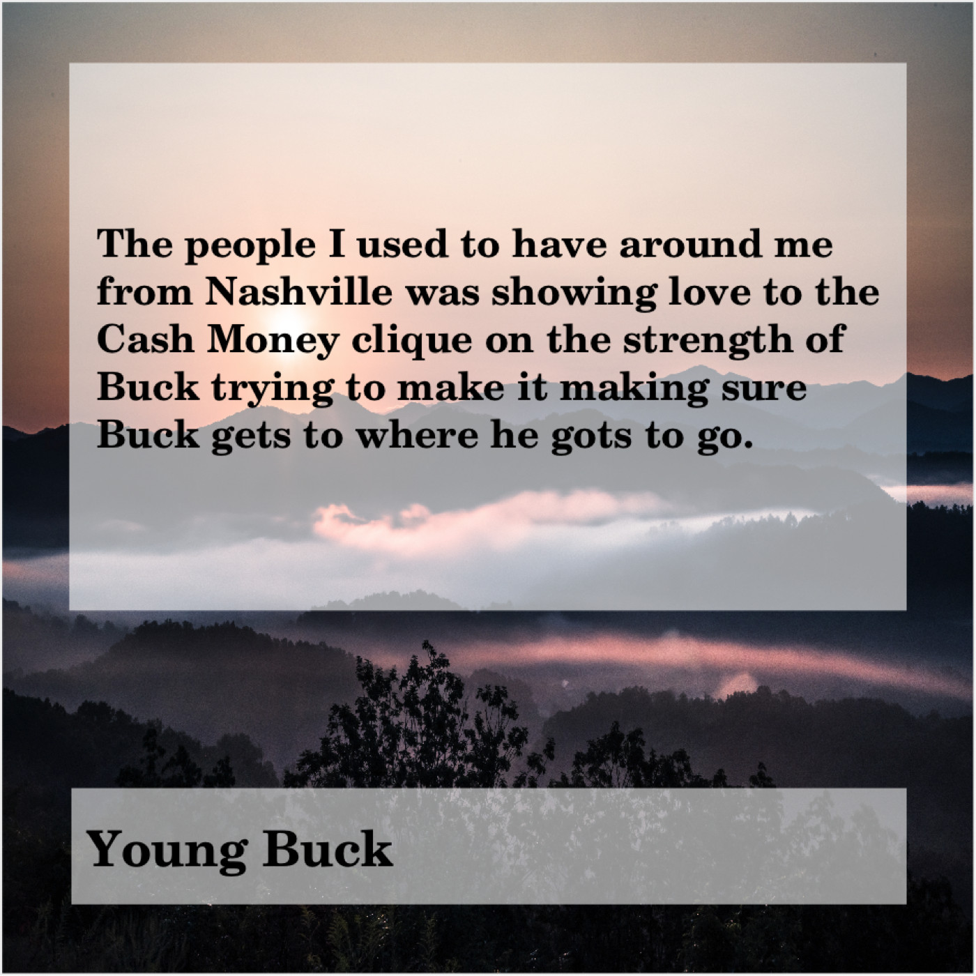 Young Buck Young Buck – The people I used to… February 14, 2019 admin “The people I used to have around me from Nashville was showing love to the Cash Money clique on the strength of Buck trying to make it making sure Buck gets to where he gots to go.”-Young Buck