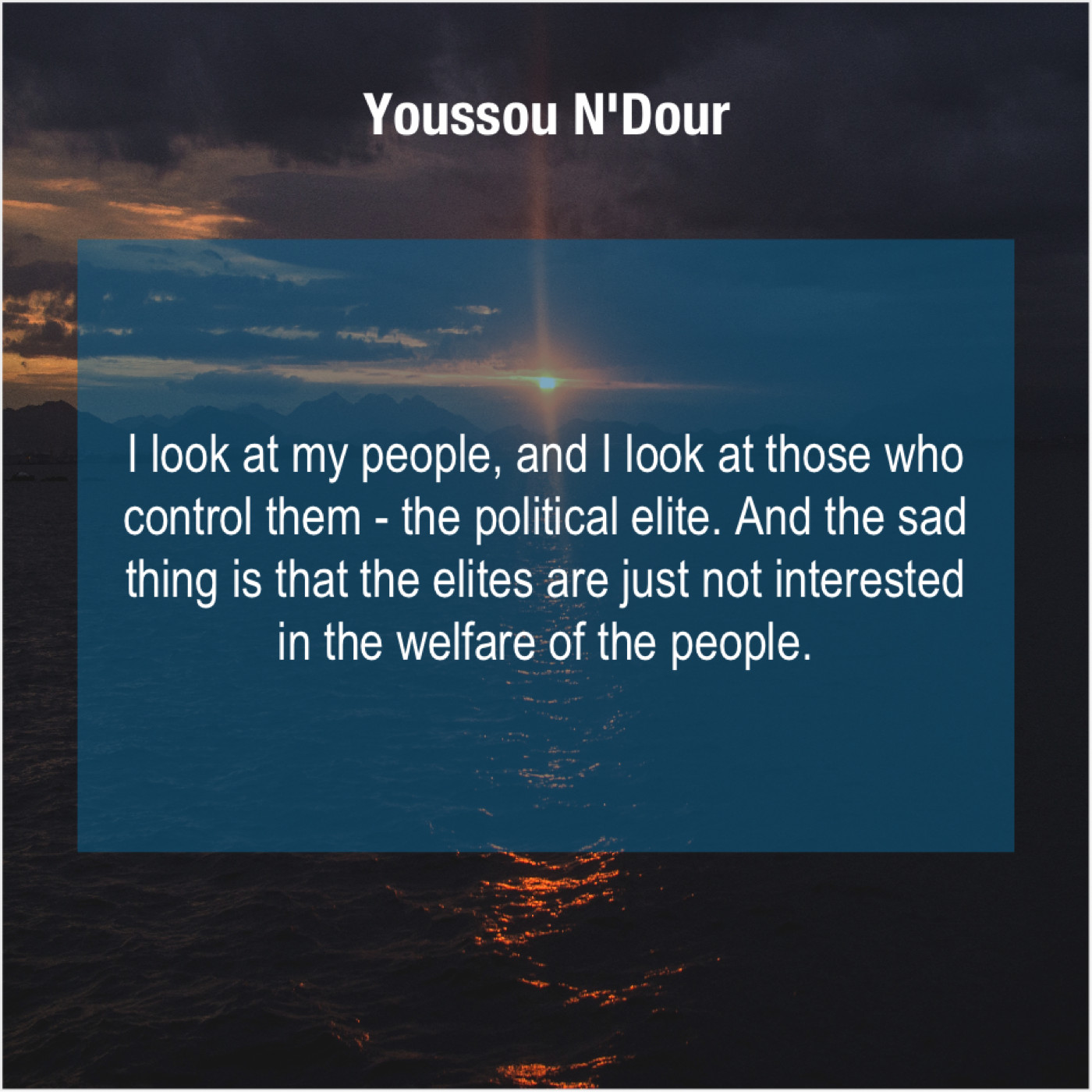 Youssou N'Dour Youssou N’Dour – I look at my people… April 17, 2019 admin “I look at my people, and I look at those who control them – the political elite. And the sad thing is that the elites are just not interested in the welfare of the people.”-Youssou N’Dour
