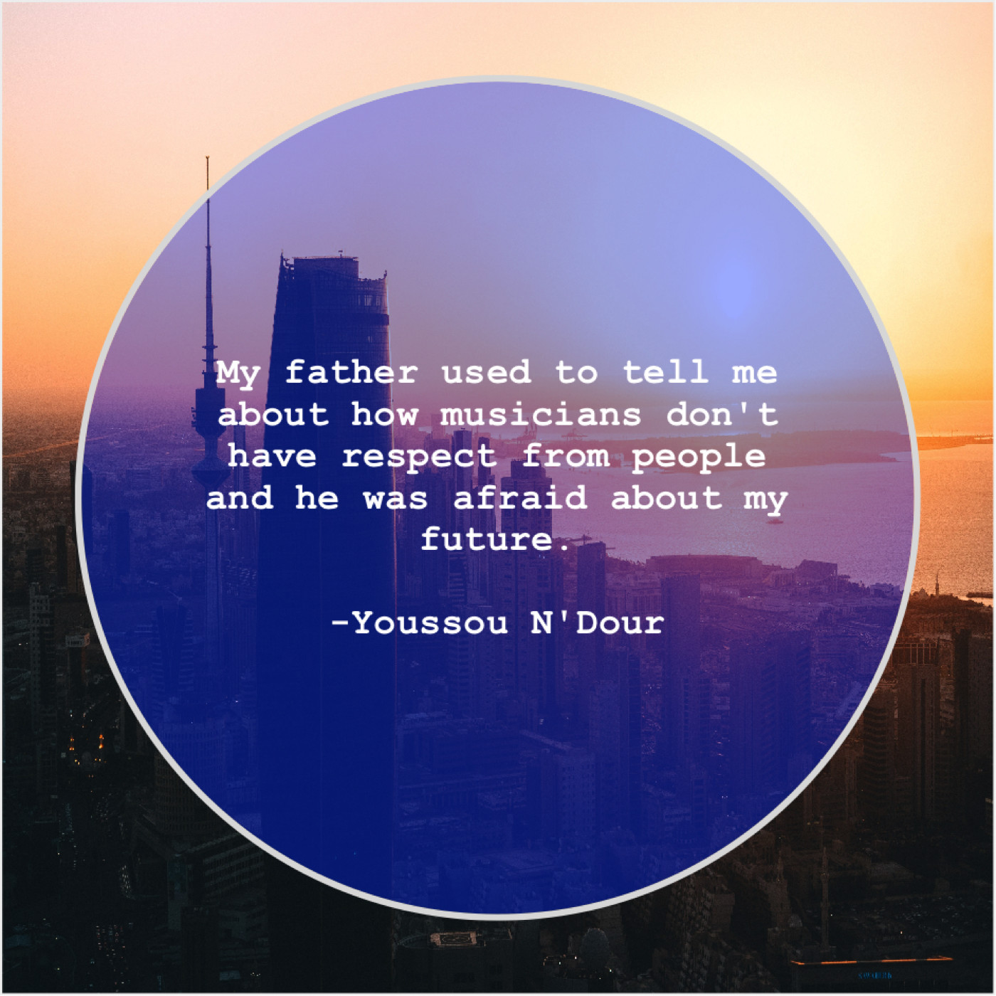 Youssou N'Dour Youssou N’Dour – My father used to tell… November 15, 2018 admin “My father used to tell me about how musicians don’t have respect from people and he was afraid about my future.”-Youssou N’Dour