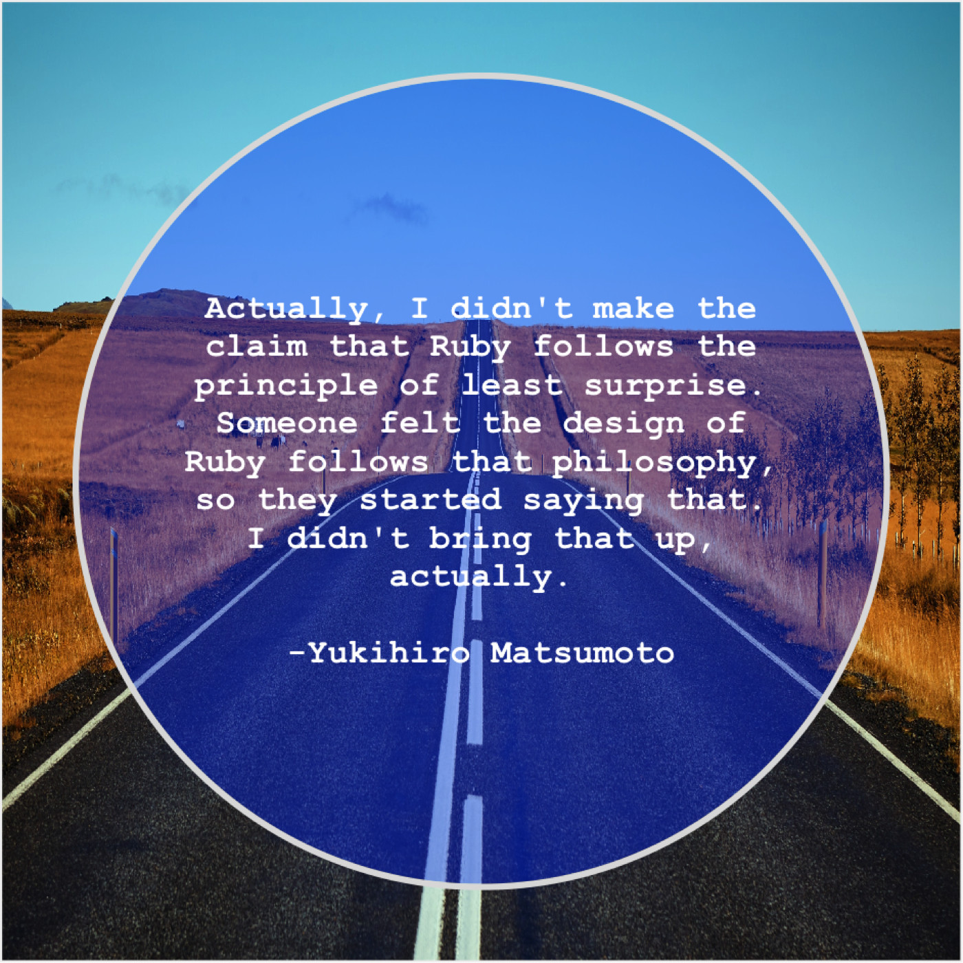 Yukihiro Matsumoto Yukihiro Matsumoto – Actually, I didn’t make the… January 8, 2019 admin “Actually, I didn’t make the claim that Ruby follows the principle of least surprise. Someone felt the design of Ruby follows that philosophy, so they started saying that. I didn’t bring that up, actually.”-Yukihiro Matsumoto