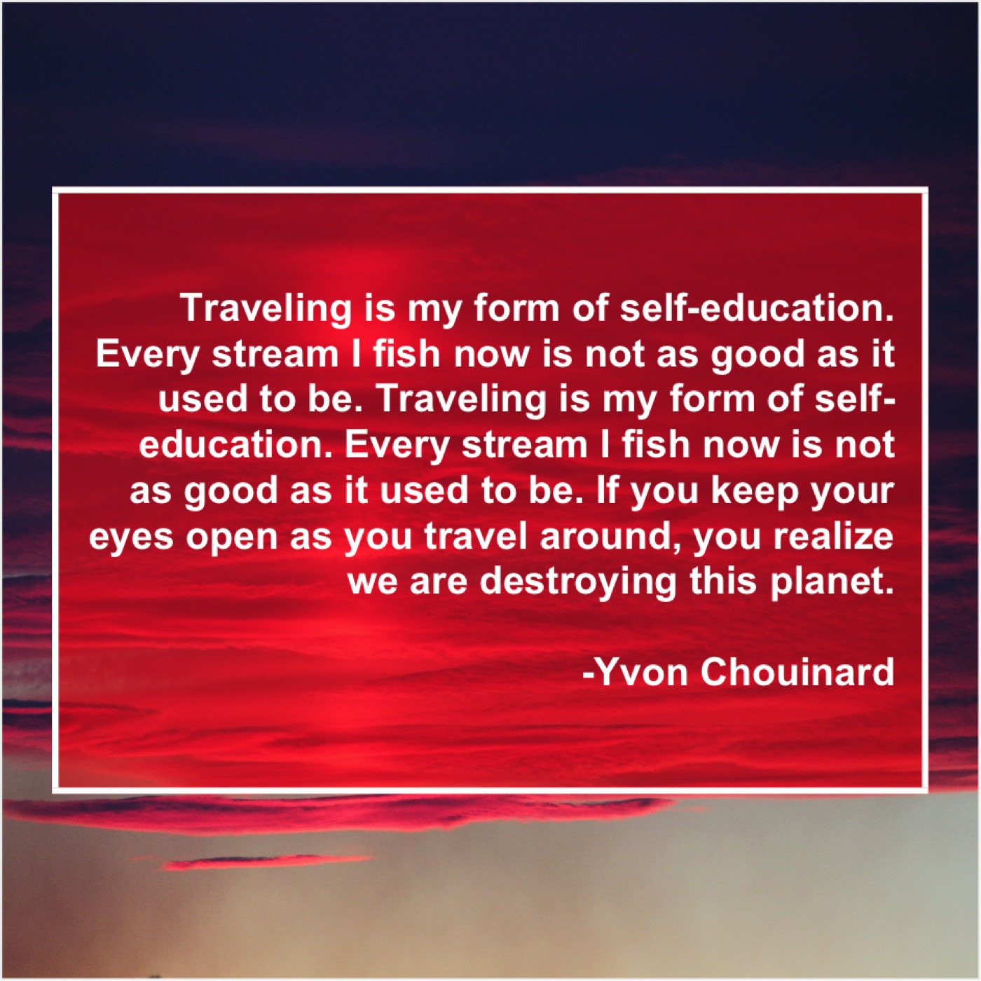 “Traveling is my form of self-education. Every stream I fish now is not as good as it used to be. Traveling is my form of self-education. Every stream I fish now is not as good as it used to be. If you keep your eyes open as you travel around, you realize we are destroying this planet.”